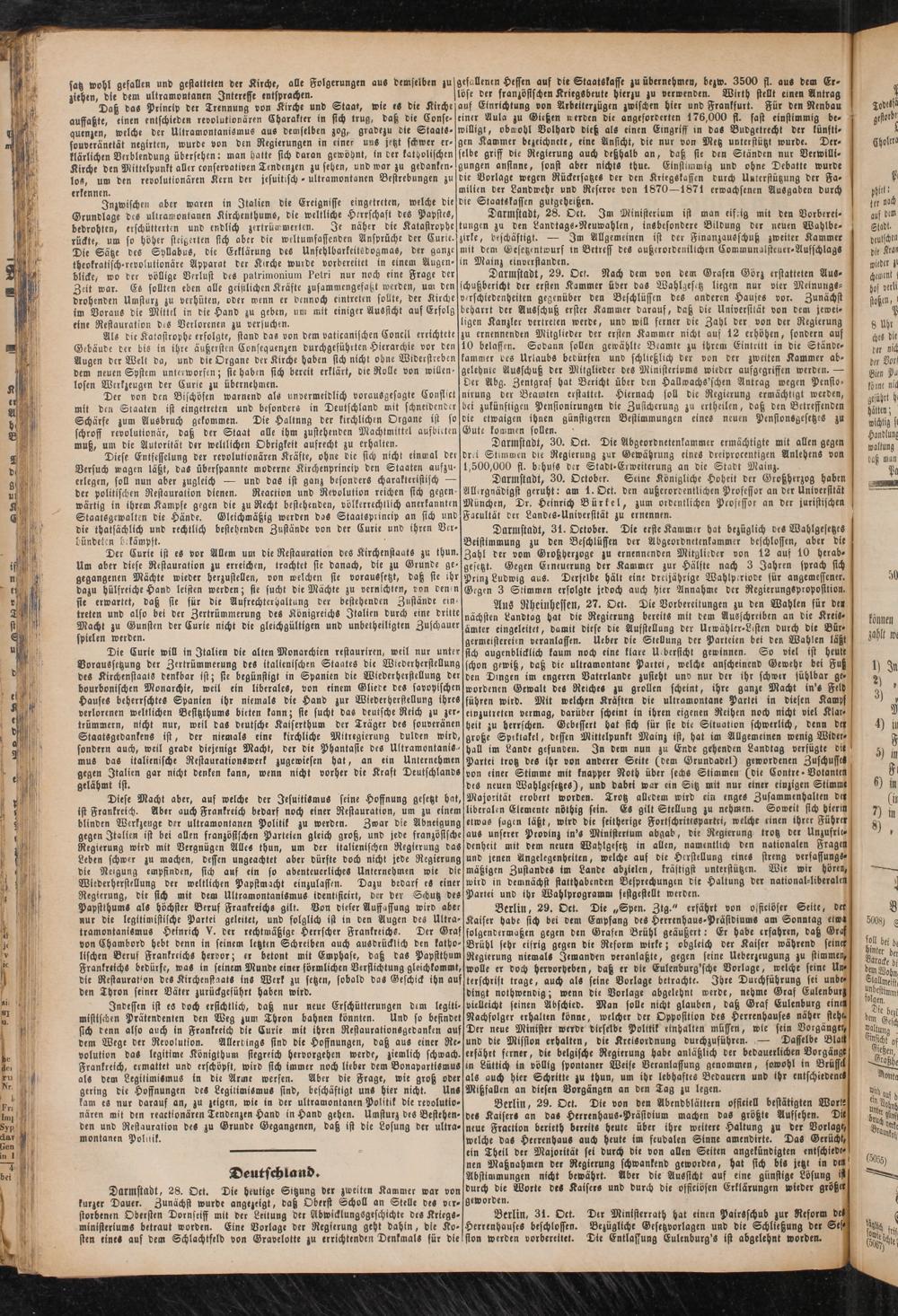 Aus Rheinhessen, 27. Okt. Die Vorbereitungen zu den Wahlen für de» nächsten Landtag hat die Regierung bereits mit dem Ausschreiben an die Kreis- ämter eingeleitet, damit diese die Aufstellung der Urwähler-Listen durch die Bürgermeistereien veranlassen, lieber Die Stellung Der Parteien bei Den Wahlen läßt sich augenblicklich kaum noch eine klare U bersicht gewinnen. So viel ist heute schon gewiß, daß die ultramontane Partei, welche anscheinend Gewehr bei Fuß den Dingen im engeren Vaterlande zusieht uno nur der ihr schwer fühlbar geworbenen Gewalt des Reiches zu grollen scheint, ihre ganze Macht in's Feld führen wird. Mit welchen Kräften Die ultramontane Partei in diesen Kamps einzutreten vermag, Darüber scheint in ihren eigenen Reihen noch nicht viel Klarheit zu herrschen. Gcbessert hat sich für sie die Situation schwerlich, Denn der große Spektakel, dessen Mittelpunkt Mainz ist, hat im Allgemeinen wenig Widerhall im Lande gefunoen. In Dem nun zu Ende gehenden Landtag verfügte die Partei trotz des ihr von anderer Seite (Dem Grundadel) gewordenen Zuschusses von einer Stimme mit knapper Noth über sechs Stimmen (Die Contre- Votanten des neuen Wahlgesetzes), und dabei war ein Sitz mit nur einer einzigen Stimme Majorität erobert worden. Trotz alledem wird ein enges Zusammenhalten der liberalen Elemente nöthig sein. Es gilt Stellung zu nehmen. Soweit sich hierin etwas fügen läßt, wird die seitherige Fortschrittspartri, welche einen ihrer Führer aus unserer Provinz in’» Ministerium abgab, die Regierung trotz Der Unzufriedenheit mit dem neuen Wahlgesetz in allen, namentlich Den nationalen Fragen und jenen Angelegenheiten, welche auf die Herstellung eines streng verfassungsmäßigen Zustande- im Lande abzielen, kräftigst unterstützen. Wie wir hören, wird in demnächst statthabenden Besprechungen Die Haltung der national-liberalen Partei und ihr Wahlprogramm sestgestellt werden.