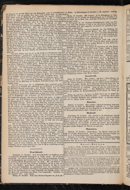 Paris, 29. December. Man versichert, daß Herr e. Biron-Gontaut am Dienstag abreifen werde, um seinen Posten in Berlin «"iutreten. — Die „$>a ne tbeilt mit, mehrere Deputirte der Rechten und de« rechten CentrumS beabsichtigten einen Antrag zu stellen, wonach sich die Regierung verbindlich matten solle, bt« rur aanrlichen Befreiung de« französischen Territorium- streng tn den Grenzen di- V rttaa« von Bordeaux zu verbleiben. Dann erst solle eine constituirende Na- tionalversammlung gewählt werden. — Bon Mühlhausener Damen wurden al* Beitrag zur Zahlung der Krieg-cntschädigung 23,945 Franc- an Thier« ge-