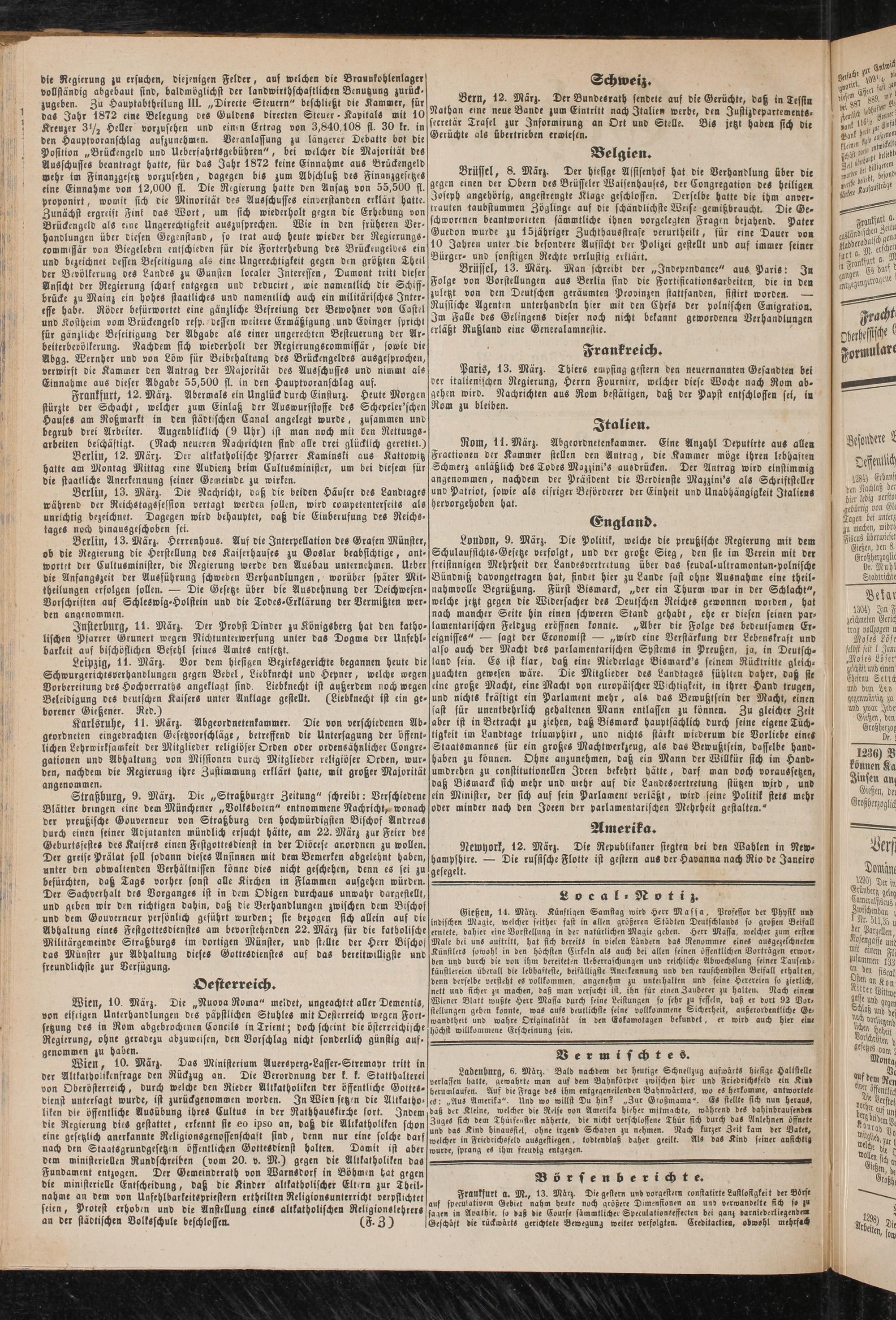 Paris, 13. März. Thiers empfing gestern den neuernannten Gesandten bei Der italienischen Regierung, Herrn Fournier, welcher Diese Woche nach Rom abgehen wird. Nachrichten aus Rom bestätigen, Daß Der Papst entschlossen sei, in Rom zu bleiben.