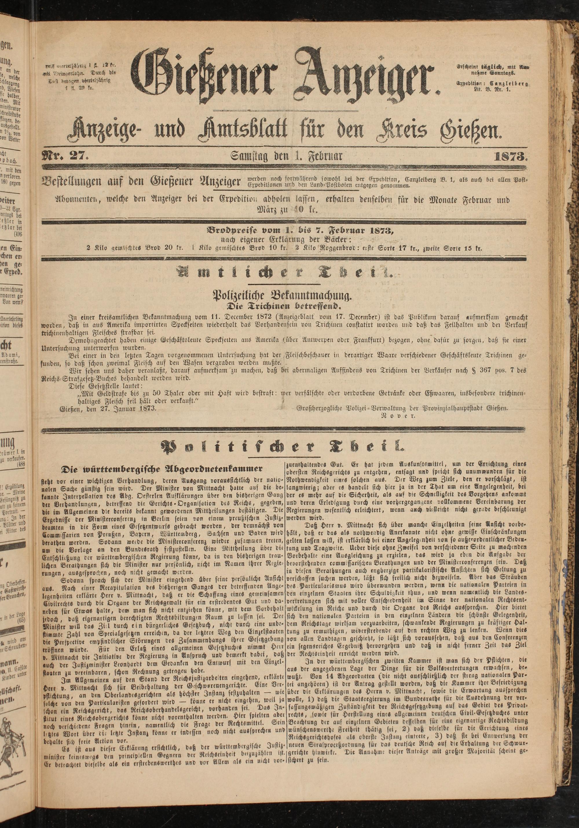 Brodpreife vom L bis 7. Februar 1873,
