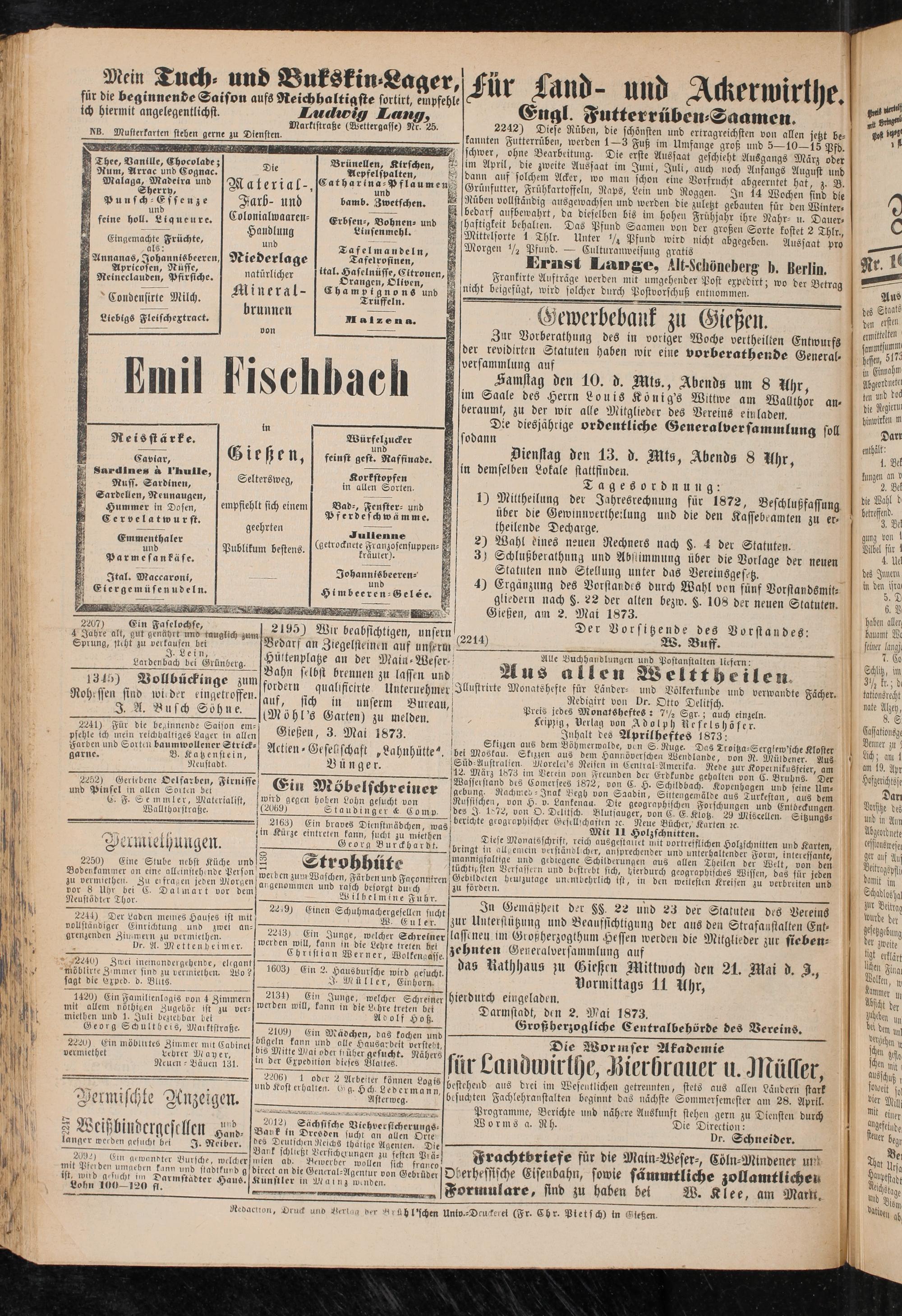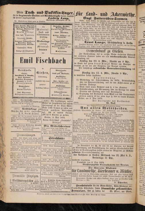 4) Ergänzung des Vorstandes durch Wahl von fünf Vorstandsmit- flltebern nach §. 22 der alten bezio. §. 108 der neuen Statuten Gießen, am 2. Mai 1873.
