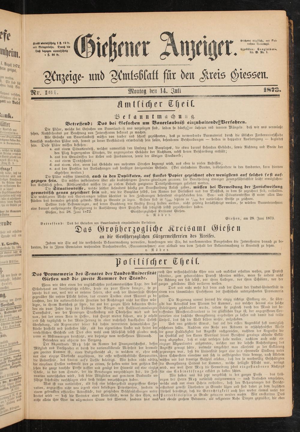 Gießen, den 28. Juni 1873. Großherzogliches Kreisamt Gießen.
