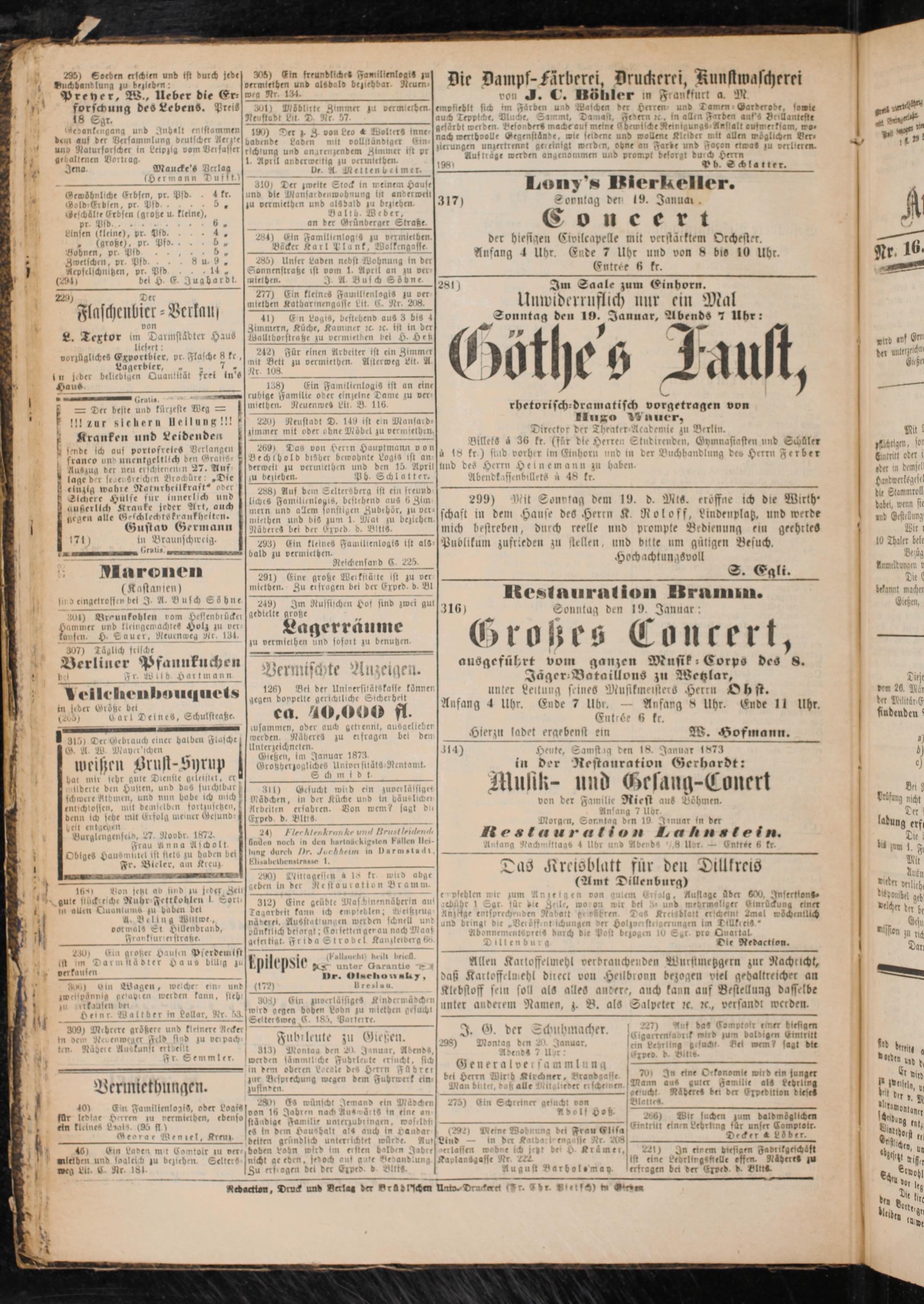 Heute, Samstrg den 18. Januar 1873 in her Xcjlnnrdtioii Wcrbarbt: Musik- und (fcrldiui-CLoiicrt von der Familie Niest au- Böhmen.