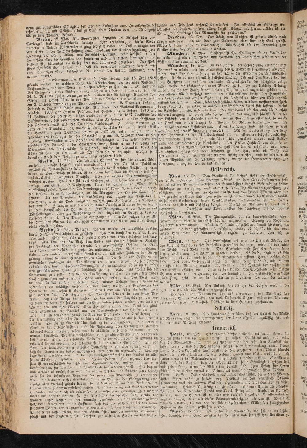 nommen tou^ndamentalitoen Kreisen ist heute vielfach des 18. Mai 1848 gedacht worden, an welchem Tag- die Uebersiedelung der deutschen 9 a tonal Versammlung aus dem Römer in die Paulsürche zu Frankfurt a. M- stattfand. Bei Gelegenheit dieser Rückerinnerung möchten wir darauf Hinwegen,daß am 24. d. Mts. 25 Jahre vergangen sind, seitdem der Reichstags-Pragdent Di- Simson als Schriftführer in den Vorstand der National-Versammlung eintrat; am 3. October wurde er zum Vice. Präsidenten, am 18. December 1848 an Heinrich v. Gagern's Stelle zum ersten Präsidenten der Nattonal-Ver,ammlung aewählt. 1850 war Simson Präsident des Volkshauses tn,@vfnrt1860» uut 61 Präsident des preußischen Abgeordnetenhauses, und feit 1867 Präsident dev conMtuirenden, des ordentlichen Norddeutschen Reichstages m allen Sessionen, des Zollparlaments und des Deutschen Reichstages. In diesen Ämtern gehörte er der Deputation an, welche Friedrich Wilhelm IV. am 3. April 184 die Erwählung zum Deutschen Kaiser zu verkünden Hatte, funkte er als Sprecher des Landtages bei der Königskronung am 18. October 1861 zu Königsberg, überbrachte er die Adreffe des Reichstages an den L-chirmherrn des Norddeutschen Bundes in die Hohenzollernbnrg, stand er an der Spitze der Deputation des Norddeutschen Reichstages, welche im Decernber 1870 den König Wilhelm zu Versailles als Deutschen Kaiser begrüßte. Mochte seine bewährte Kraft dem Reichstage noch lange erhalten bleiben.
