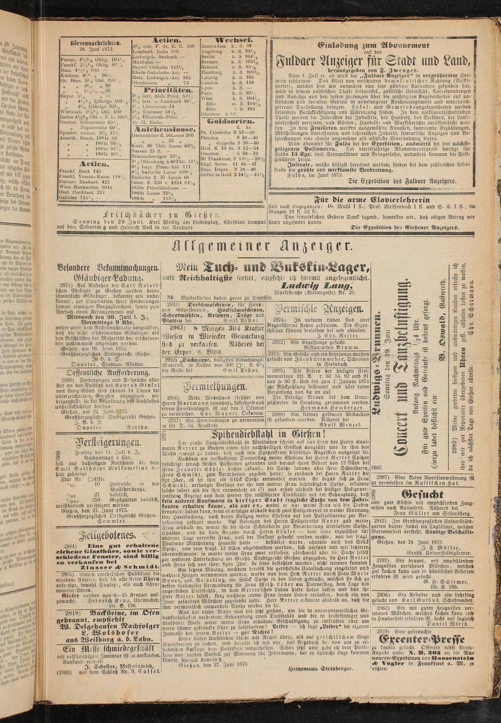 Gießen, den 27. Juni 1873. Graßhcrzogliches Ortsgericht Gießen.