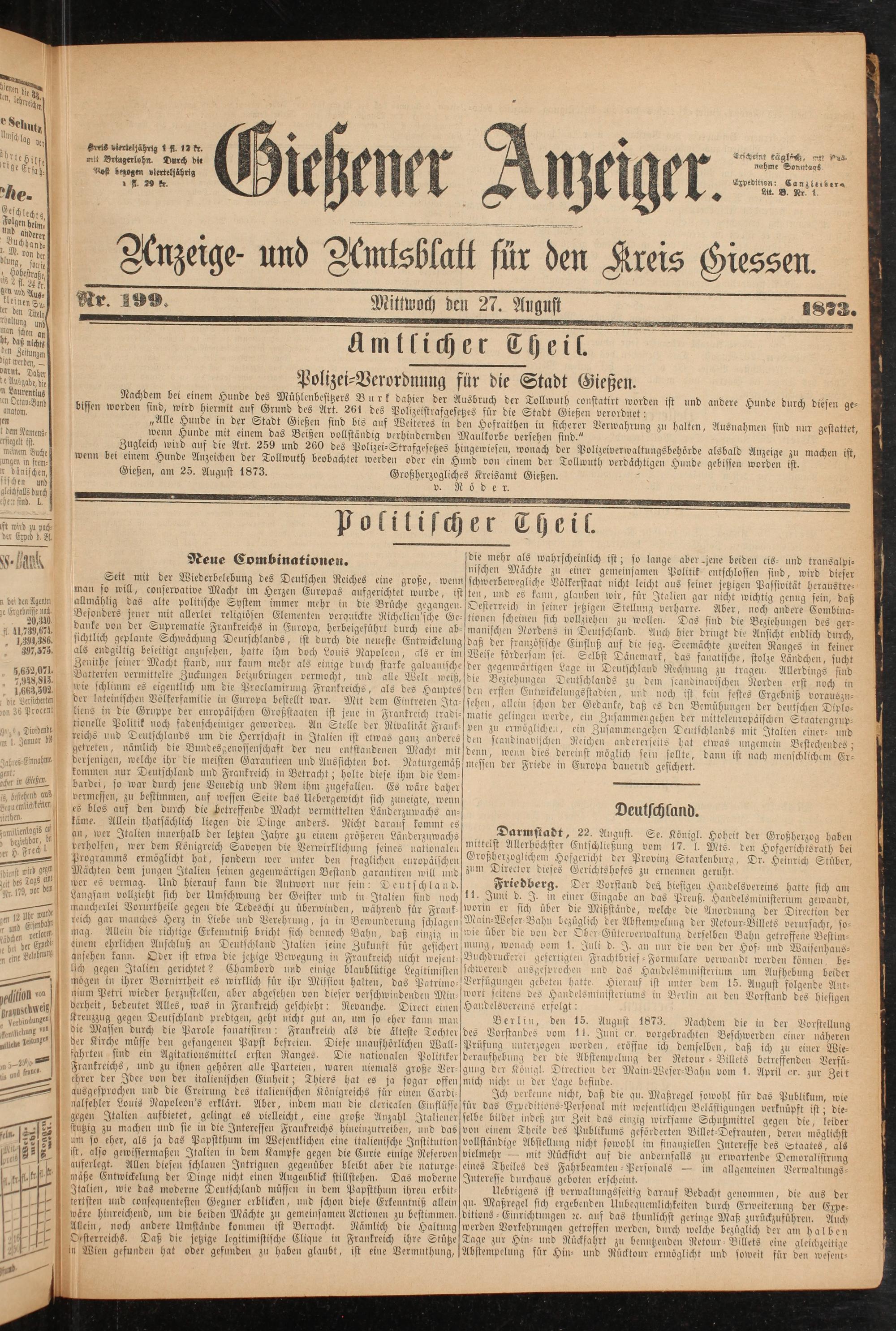 Gießen, am 25. August 1873. Großherzogliches Kreisamt Gießen.