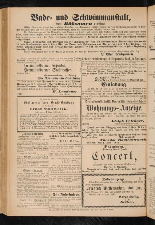 2610) Indem ich hiermit das verehrliche Publikum zum Abonnement einlade, bemerke ich, daß der Schwimmunterricht für Mädchen fortgesetzt wird und bitte um baldige Anmeldungen, damit die Unterrichtszeit festgesetzt werden kann.