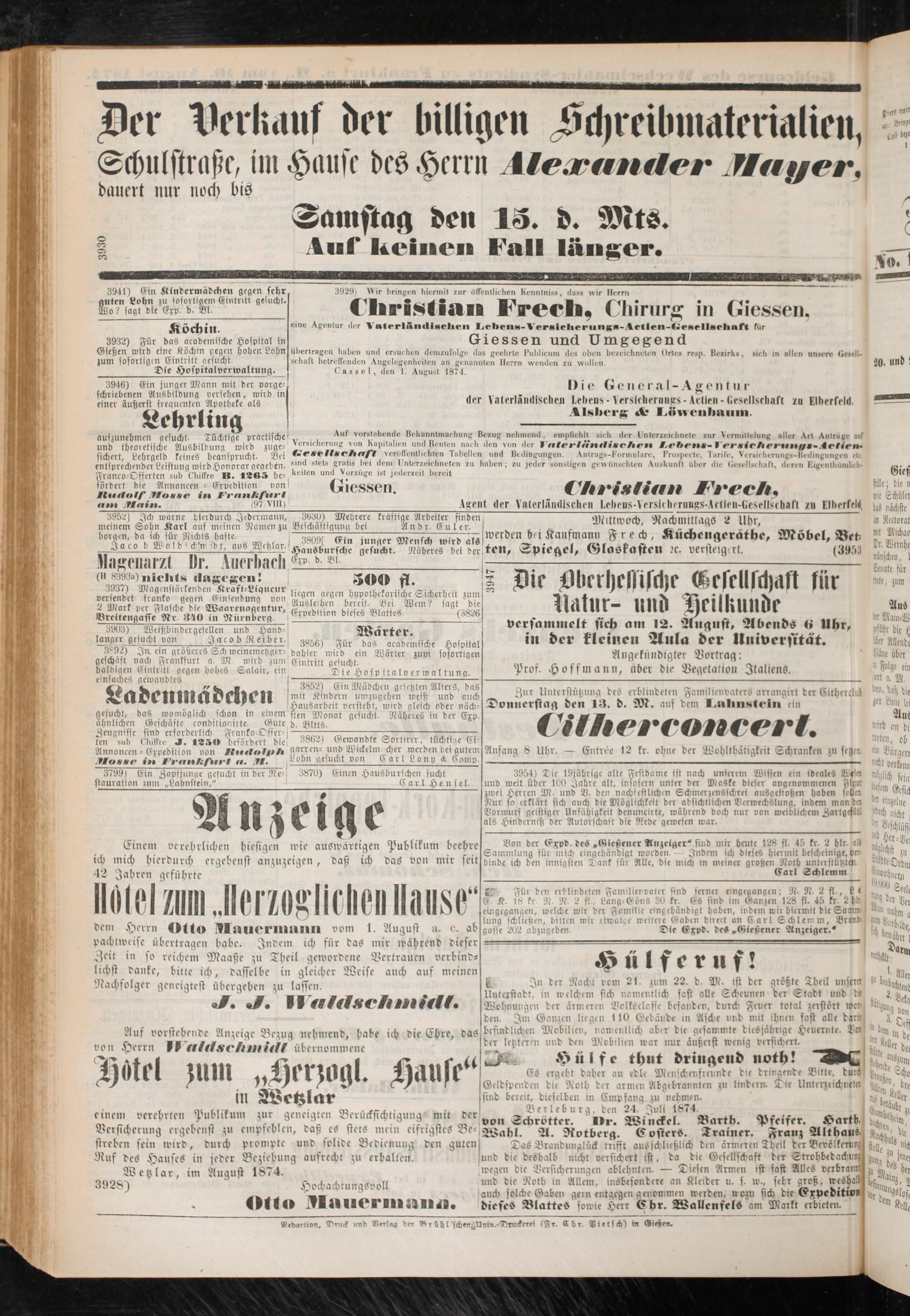 Wetzlar, im August 1874. wegen die Versicherungen ablehnten. — Tiefen Armen ist fast Alles verbräun