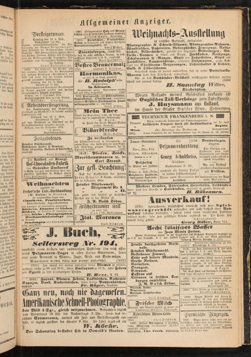 Photographie- Sf Schreib-Albums, Photographie-Rakmen, Wandtaschen, Papeterien, Gesangbücher, Feuerzeuge, Notiz» bischer, Bilderbücher, gemalte und ung-malrc Bilderbogen, Ankleide - Puppen in Etuis und Bogen, Farbkasten, Reißzeuge, Schulmappen Sf - Ranzen, Etuis mit Faberftiften, VtuiS mit Farbstiften, Lampenschirme, geschnitzte Kolzwaarcn, große Au«- wabl von Christbaum-Verzierungen, Lichtcrhaltcr Sf Lichter, Gold- 8f Silberschaum.