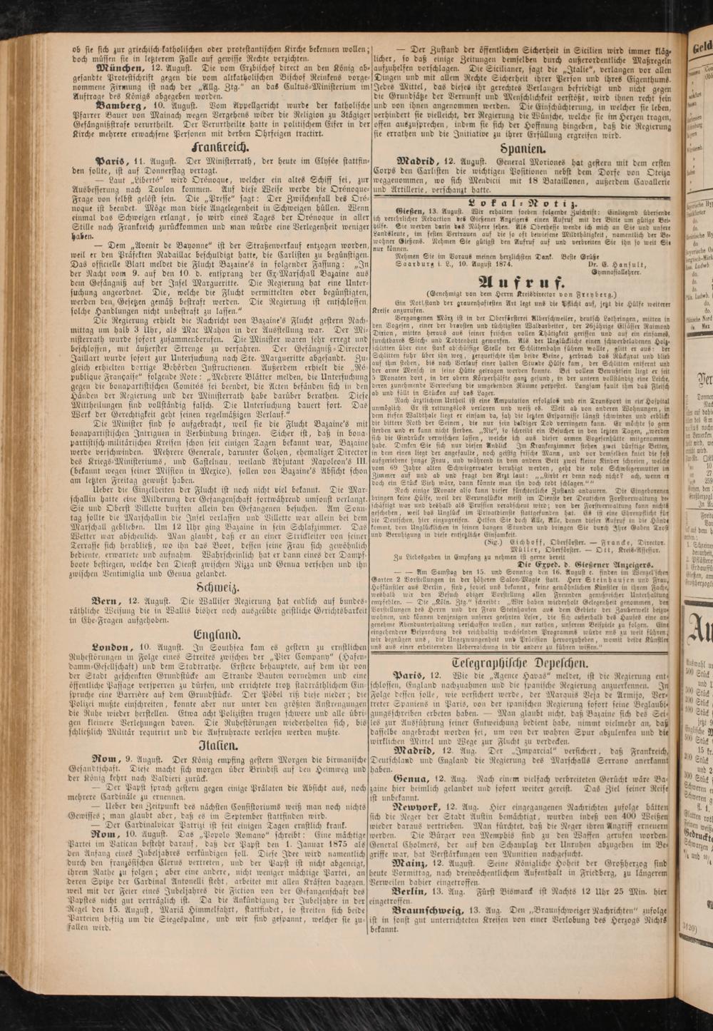 Gießen, 13. August. Wir erhalten soeben folgende Zuschrift: tiinhegent) übersende ich verehrlicher Redaction »cs Gießener Anzeiger- einen Aufruf mit der Bitte um gütige Beihilfe. Sie werden darin daS Nähere sehen, Als Oberbesse wende ich mich an Sie und unsere Landsleute, im festen Vertrauen auf die so oft bewiesene Mtldthätigkett, namentlich der Bewohner Gießens. Nehmen Sie gütigst den Aufruf auf und verbreiten Sie ihn so weit Sie nur können.