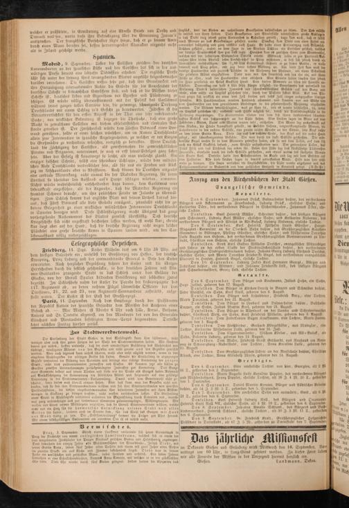 Den 8. September. Karl Heinrich Wilhelm Louis Günther, Haupt- Magazins - Verwalter an der Oberdess. Bahn dahier, des Grosiherzoglichcn Kataster» Geometers in Büdingen, Philipp Günther, ehelicher Sohn; und Wilhelmine Dorothea Luise Altguste von Gehren, des verstorbeiten Grostherzoglichen RentamtmannS zu Umstadt, Christian von Gehren, eheliche Tochter.