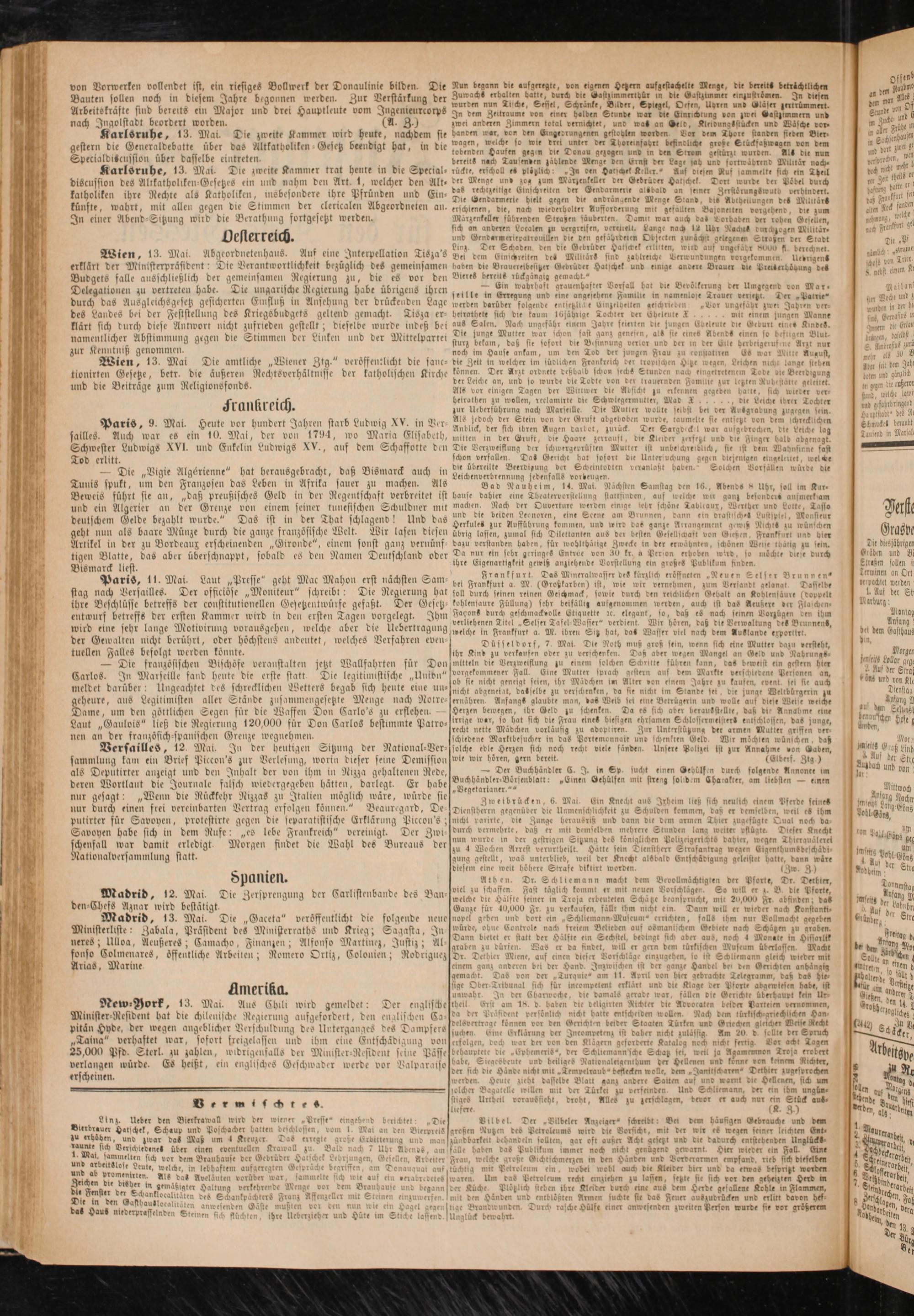 Versailles, 12. Mai. Jn der Heutigen Sitzung der National-Ver- solche edle Herzen sich noch reckt viele fänden. Unsere Polizei ist zur Annahme von Gaben, sammlung kam ein Brief Piccon's zur Verlesung, worin dieser seine Demission wie wir hören, gern bereit. (Libers. Ztg )