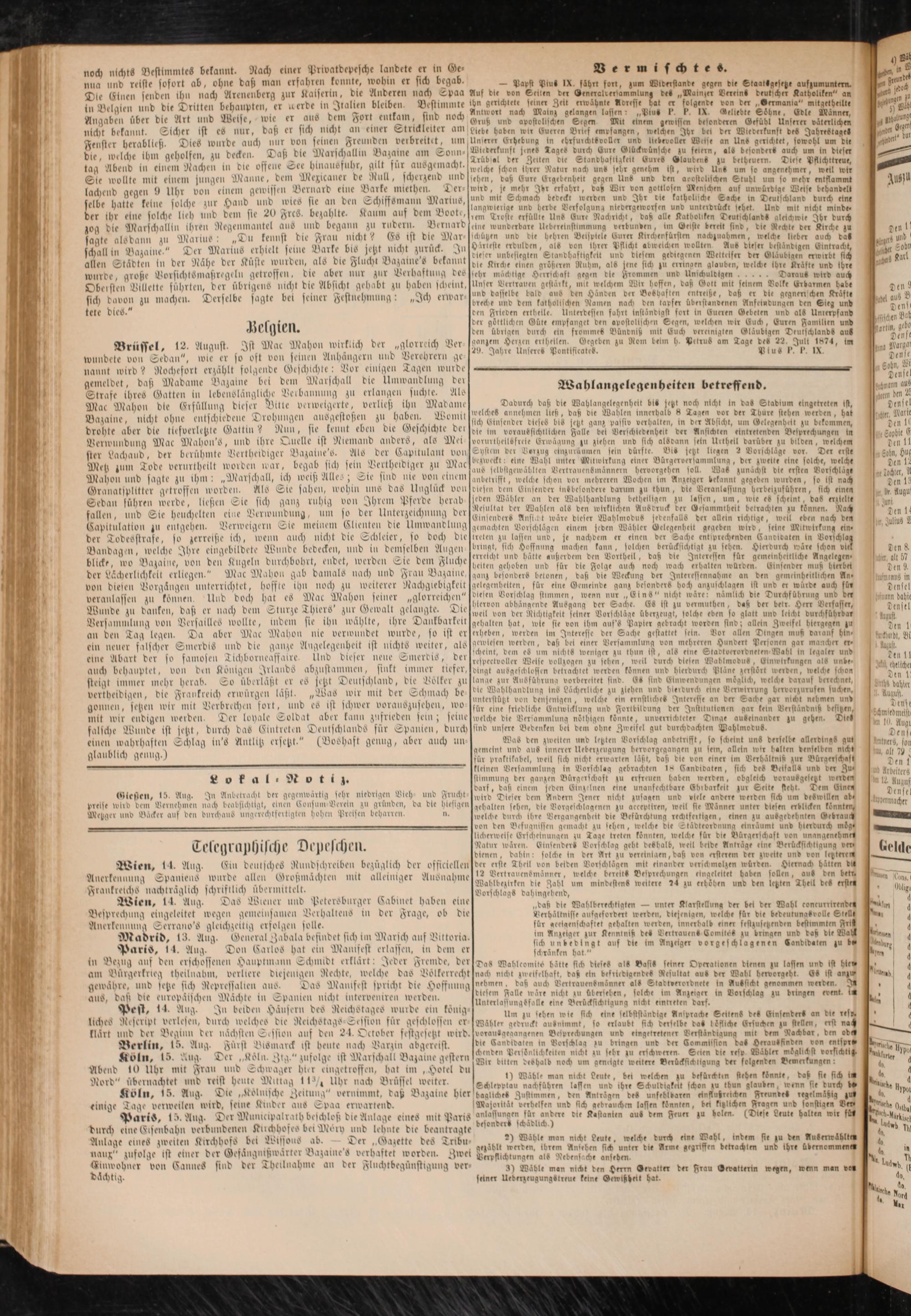 Köln, 15. Aug. Die „Kölnische Zeitung" vernimmt, daß Bazaine hier einige Tage ocnoblen wird, seine Kinder aus Spaa erwartend.