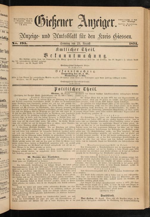 Gießen, 22. August. ! Denkschrift des Vereins deutscher Tabaksinleressenten niedergelegten Gründen (.Fortsetzung des Berichts Großh. Handelskammer aus Nr. 193 d. Bltts.) Ivollstänlig an.
