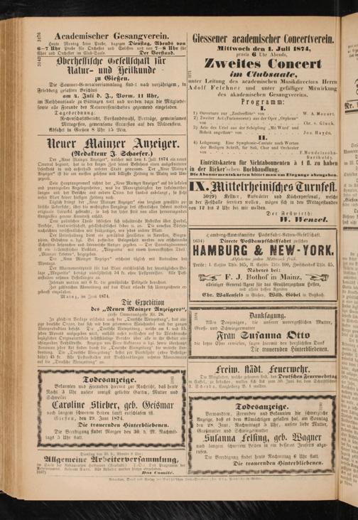 Der „Neue Mainzer Anzeiger", welcher mit dem l.Juli 1874 ein neues Quartal beginnt, hat in der kurzen Zeit seines Bestehens einen ausgebreitetcn Leserkreis in und außerhalb unserer Stadt gewonnen. Der „Neue Mainzer Anzeiger" ist die am meisten gelesene und billigste Zeitung in Mainz und Umgegend.