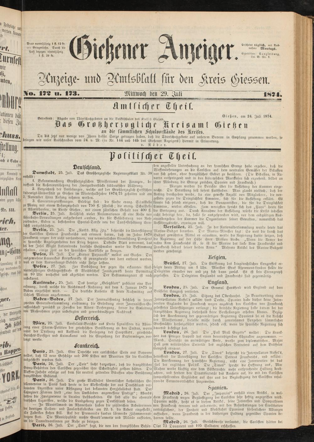 Berlin, 25. Juli. Die „Nordd. Allg. Ztg." bespricht die Unterstützung der Carlisten Seitens Frankreichs und erinnert daran, daß im Jahre 1870 Frankreich wegen der nicht vorhandenen, mir vermeintlichen Einmischung Preußens in spanische Angelegenheiten den Krieg begann. Dasselbe Blatt vernimmt, das bei der Insel Wight stationirende deutsche Geschwader werde die Bestimmung erhalten, einige Zeit an der spanischen Nordküste zu kreuzen.