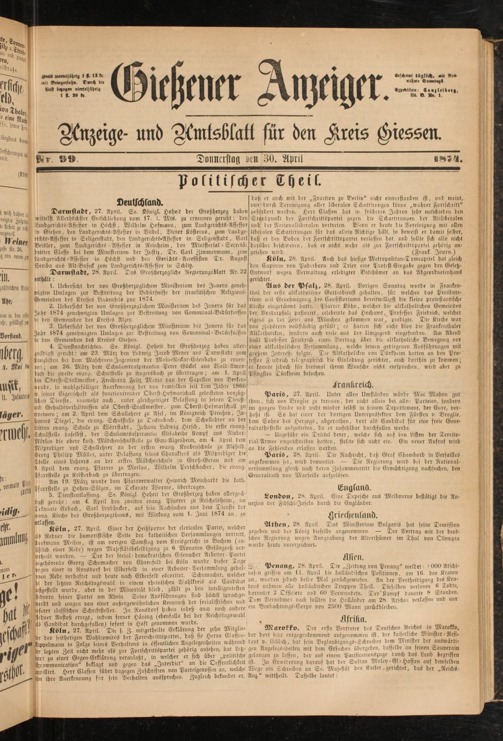 Darmstadt, 27. April. Se. König!. Hoheit der Großherzog haben mittelst Allerhöchster Entschließung vom 17. 1. Mts. zu ernennen geruht: den Landgerichts-Assessor in Höchst, Wilhelm Hofmann, zum Landgerichts-Asiessor ir Gießen, den Landgerichts-Assessor in Vilbel, Victor Kösterue, zum Landge- richto-Asiesior in Seligenstadt, den Landgerichts-Assessor in Seligenstadt, Carl Beisler, zum LandgerichtS-Assessor in Reinheim, den Ministerial - Secretät dritter Elaste bei dem Ministerium der Justiz, Dr. Carl Zimmermann, zum Landgerichts-Assessor in Höchst und den Gerichts -Accessisten Tr. August Scriba aus Alt-Buseck zum Landgerichts-Assessor in Schlitz.