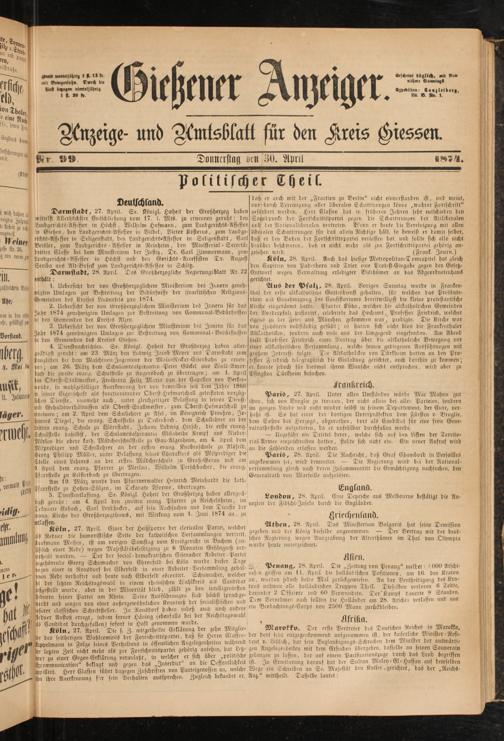 5. Dienstentlassung. Se. König!. Hoheit der Großherzog haben allergnä- London, 28. April. Eine Depesche aus Melbourne bestätigt die An- digst geruht: am 4. April den zweiten evang. Pfarrer zu Reichelsheim, "Norton der Fidschi-Inseln dnrch die Engländer.