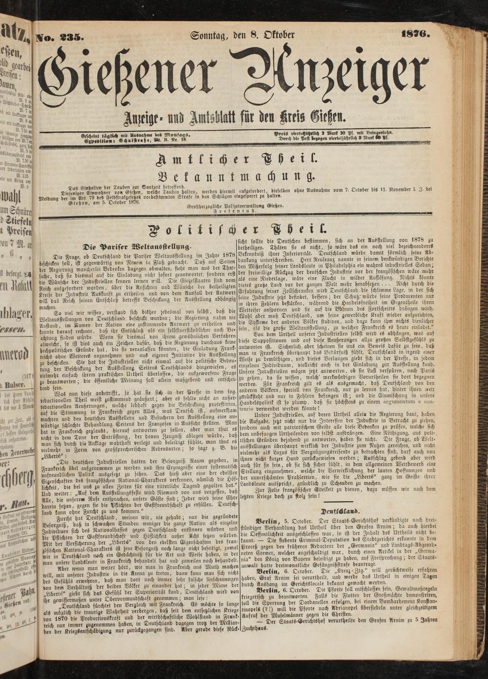 Gießen, am 5. October 1876. Großherzogliche Polizeiverwaltung Gießen.