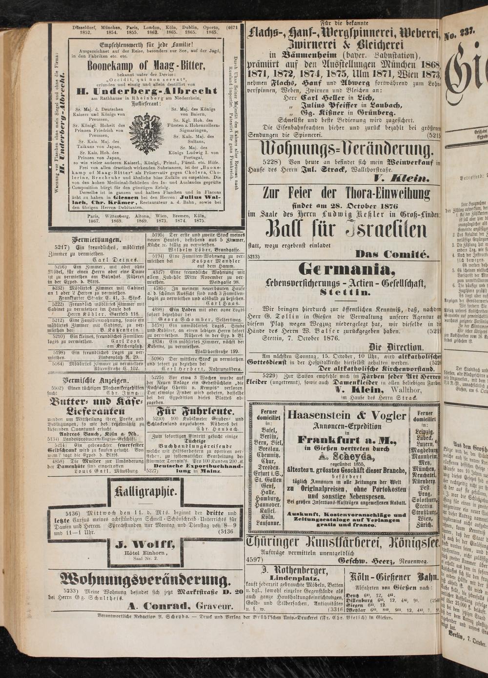 Wir bringen hierdurch zur öffentlichen Kenntnist, baß, nachdem Herr G. Tollin in Gießen die Verwaltung unserer Agentur an diesem Platz wegen Wegzug niedergclegt hat, wir dieselbe in Bit Hände des Herrn W. Balser zurückgegeben haben. (5219