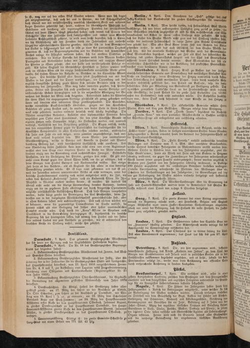 Berlin, 9. April. Man spricht davon, daß Feldmarschall Graf Moltke beabsichtige, sich von seiner anstrengenden Thätigkeit ganz zurück zu ziehen, da 'eine Gesundheit erheblich angegriffen ist und sie ihm wahrscheinlich eine -Wiederaufnahme der Arbeit in ihrem vollen Umfange nicht gestattet. Es heißt daß der Kaiser den Grafen Moltke nicht gern aus der Stellung scheiden sieht' welche der verdiente Feldmarschall so lange Jahre zum Ruhme Deutschlands inne gehabt hat. Wie aber Graf Roon seiner Zeit den Rechten der Natur gehorchen mußte, so wird das auch schließlich bei dem Grafen Moltke der Fall sein. Als der eventuelle Nachfolger des Grafen wird der Generalmajor Graf Wartensleben bezeichnet, welcher zur Zeit als Chef der historischen Ab- theilung des großen Generalstabes fungirt und den Chef des Generalstabes während seines Urlaubes bereits vertritt. Graf Wartensleben hat sich als militärischer Schriftsteller wie in der Ausübung des praktischen Generalstabsdienstes einen berühmten Namen erworben.