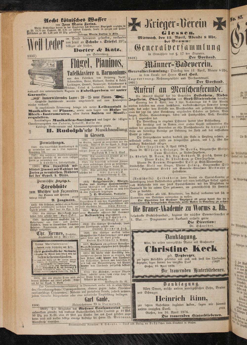 Generalversammlung: Dienstag den 11. April, Abends 8 Uhr, in dem Locale des Herrn Carl Heil.