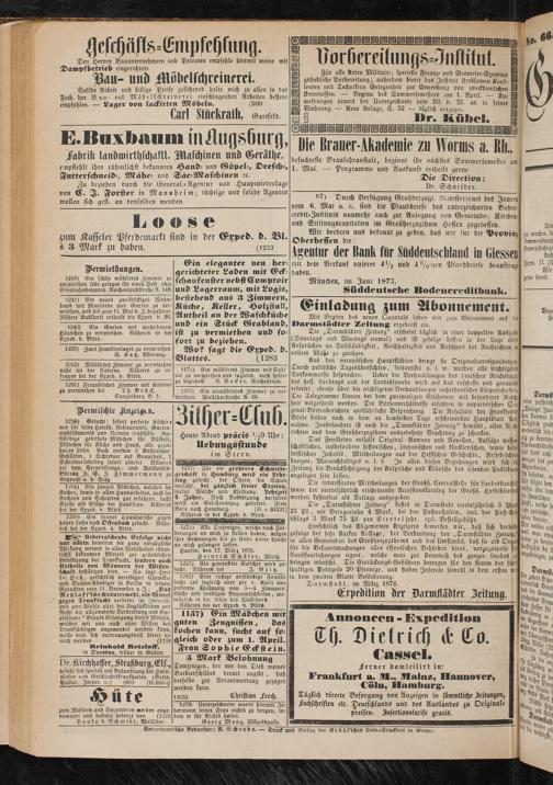 _ Die „Darmstädter Zeitung" erscheint täglich in einer doppelten Ausgabe (Sonntags und Montags einmal) und ist zufolge deffen in der Lage allen Ansprüchen an Vollständigkeit, Reichhaltigkeit und Raschheit der Nachrichten in vollem Maße zu genügen-