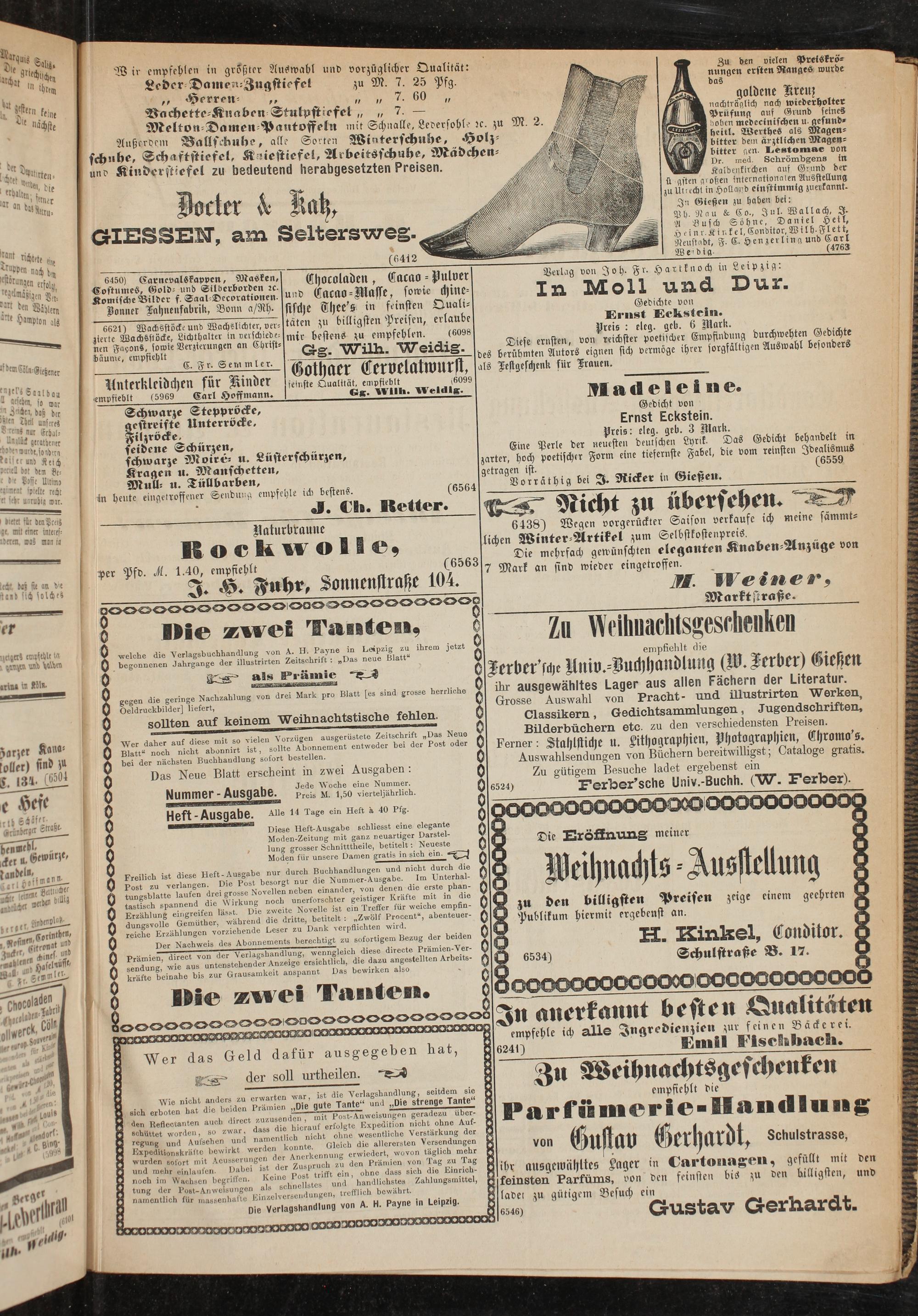 0 Grosse Auswahl von Pracht- und illustnrten Werken, 0 Classikern, Gedichtsammlungen, Jugendschriften, 0 Bilderbüchern etc. zu den verschiedensten Preisen. , 0 Ferner: Stahlstiche u. Lithographien, Photographien, Chromo's. 0 Auswahlsendungen von Büchern bereitwilhgst; Cataloge gratis. 0 Zu gütigem Besuche ladet ergebenst em