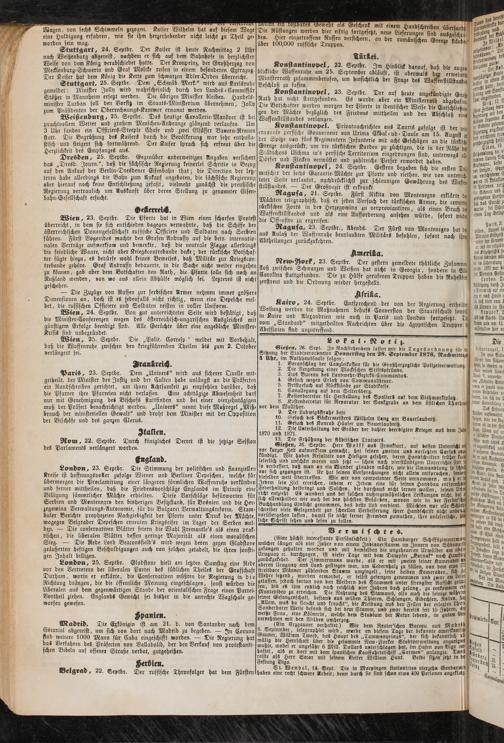 London, 23. Septbr. Die Stimmung der politischen und finanziellen Kreise ist hoffnungsvoller zufolge Wiener und Berliner Depeschen, welche für übermorgen die Proclamirnng einer längeren förmlichen Waffenruhe verkünden und ferner mittheilen, daß die Friedensvorschläge Englands im Princip eine Billigung sämmtlicher Mächte erhielten. Diese Vorschläge befürworten für Serbien und Montenegro den bisherigen Besitzstand, für Bosnien und die Herzegowina Verwaltungs-Autonomie, für die Bulgarei Verwaltungsreform. Stam- buler Berichte prophezeien Nachgiebigkeit der Pforte unter Druck der Mächte, wogegen Belgrader Depeschen erneuten Kriegseifer im Lager der Serben melden. — Die conservativen Blätter feiern die Wahl Fremantle's als einen praktischen, die liberalen Blätter deffen geringe Majorität als einen moralischen Sieg. — Die Rede Lord Beaconsfield's wird wegen deren gegen Gladstone geäußerten heftigen Beschuldigungen auch von solchen getadelt, die ihren sonstigen Inhalt billigen.