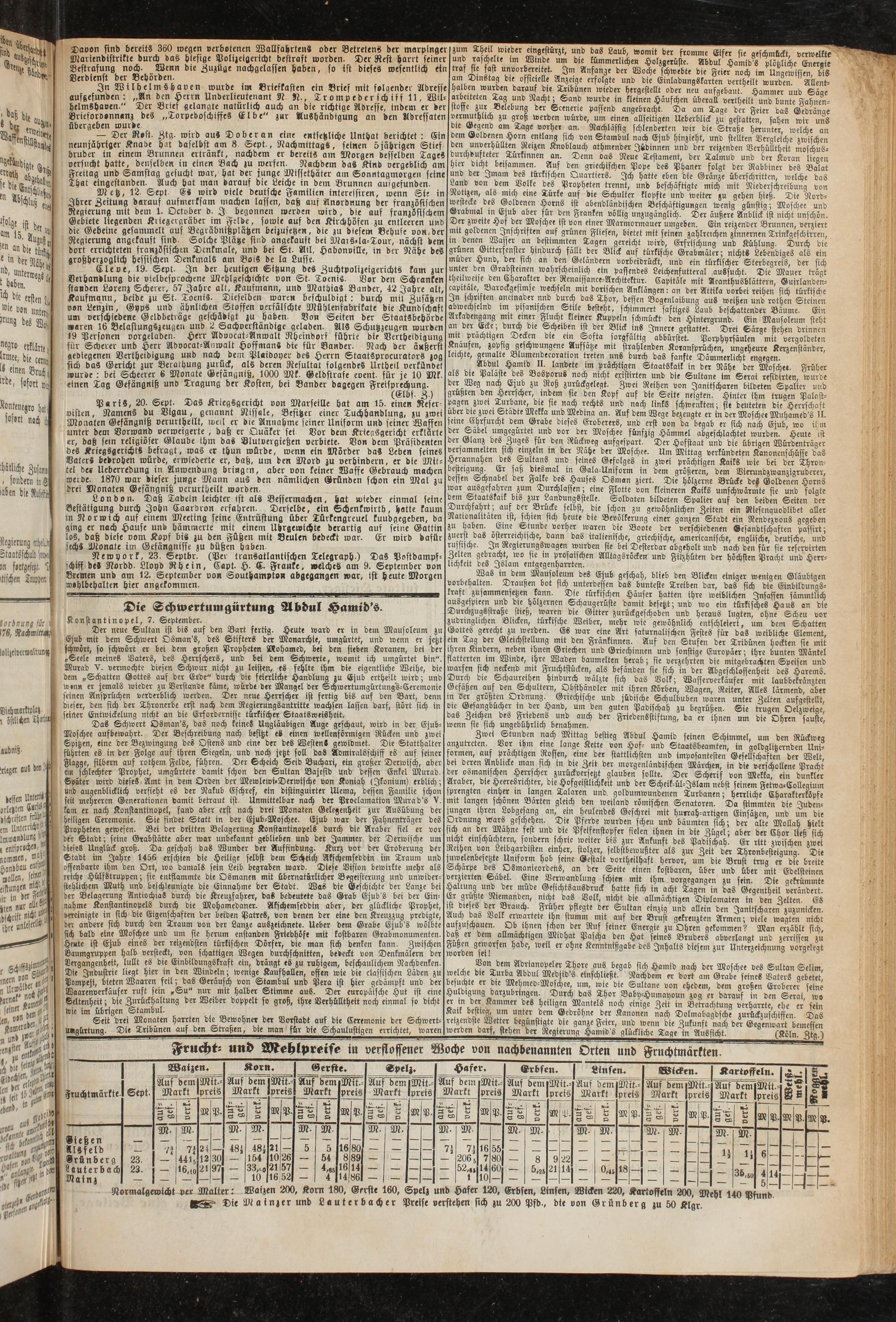Walzen 200, Korn 180, Gerste 160, Spelz und Hafer 120, Erbsen, Linsen, Wicken 220, Kartoffeln 200, Mehl 140 Pfund egg» Die M a inzer und Lauterbacher Preise verstehen sich zu 200 Pfd., die von Grünberg zu 50 Klgr.