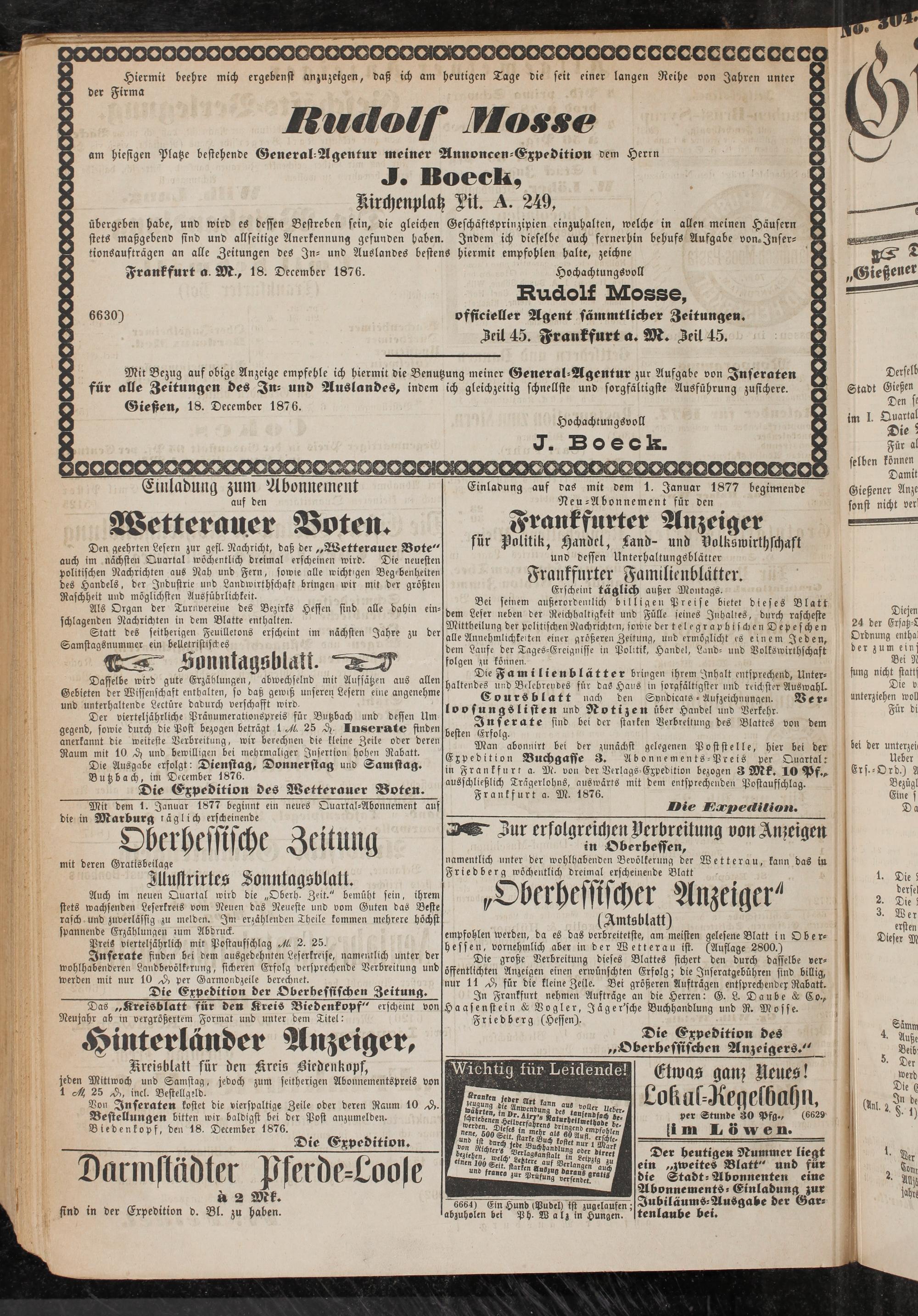 Von Inseraten kostet die vierspaltige Zeile oder deren Raum 10 Bestellungen bitten wir baldigst bei der Post anzumelden. Biedenkopf, den 18. December 1876.