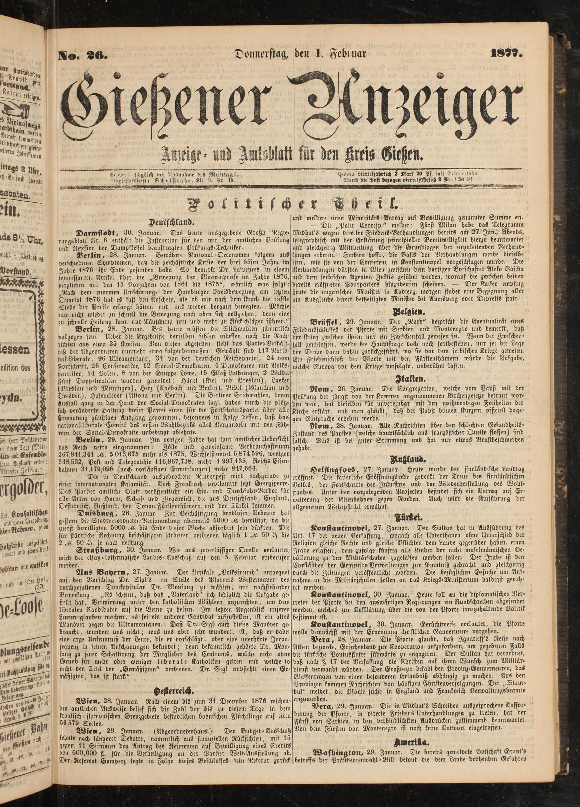 — Die „Polit. Corresp." meldet: Fürst Milan habe da- Telegramm Midhat's wegen directer Friedens-Verhandlungen bereits am 27. Jan., Abends, telegraphisch mit der Erklärung principieller Bereitwilligkeit hierzu beantwortet und gleichzeitig Mittheilung über die Grundlagen der einzuleitenden Verhandlungen erbeten. Serbien hofft, die Basis der Verhandlungen werde dieselbe ein, wie sie von der Conferenz in Konstantinopel vorgeschlagen wurde. Die Verhandlungen dürften in Wien zwischen dem dortigen Botschafter Aleko Pascha und dem serbischen Agenten Zuktis geführt werden, worauf die zwischen beiden bereit- eröffneten Pourparlers hinzudeuten scheinen. — Der Kaiser empfing heute die ungarischen Minister in Audienz, morgen findet eine Begegnung aller am Ausgleiche direct betheiligten Minister bet Auersperg oder Depretis statt.