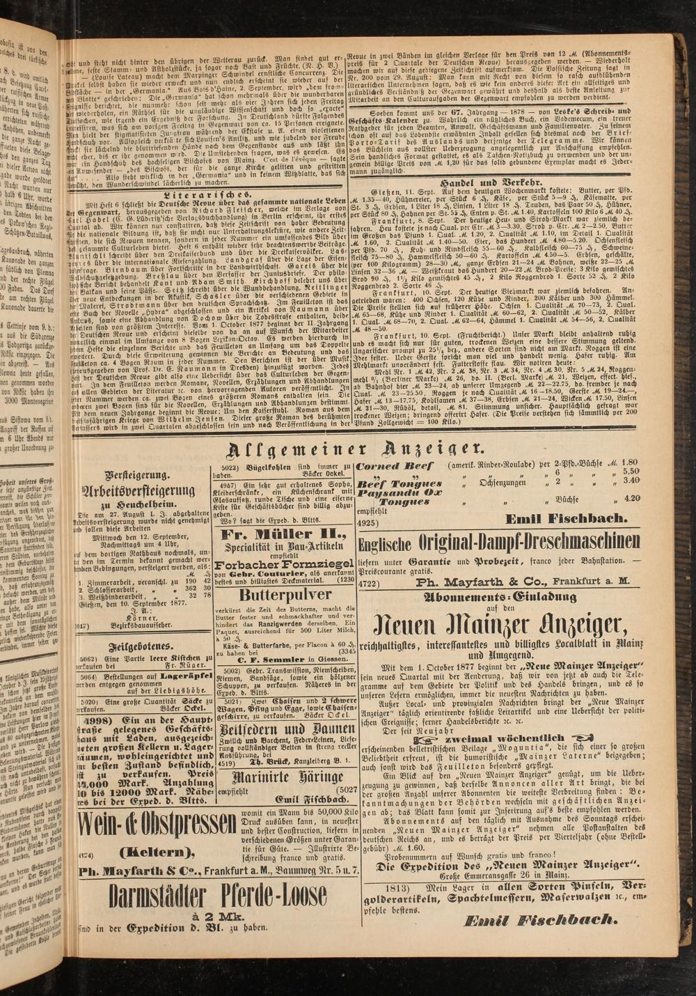 Mit dem 1. October 1877 beginnt der „Neue Mainzer Anzeiger" sein neues Quartal mit der Aenderung, daß wir von jetzt ab auch die Telegramme aus dem Gebiete der Politik und des Handels bringen, und es so unseren Lesern ermöglichen, immer die neuesten Nachrichten zu haben.