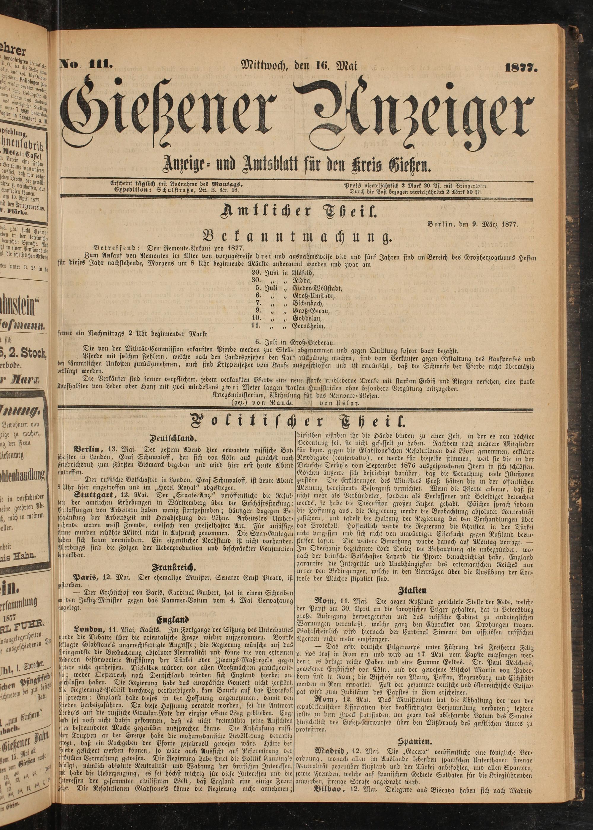 . Zum Ankauf von Remonten im Atter von vorzugsweise drei und ausnahmsweise vier und fünf Jahren sind im Bereich des Großherzogrbums Hessen für dieses Jahr nachstehende, Morgens um 8 Uhr beginnende Märkte anberaumt worden und zwar am