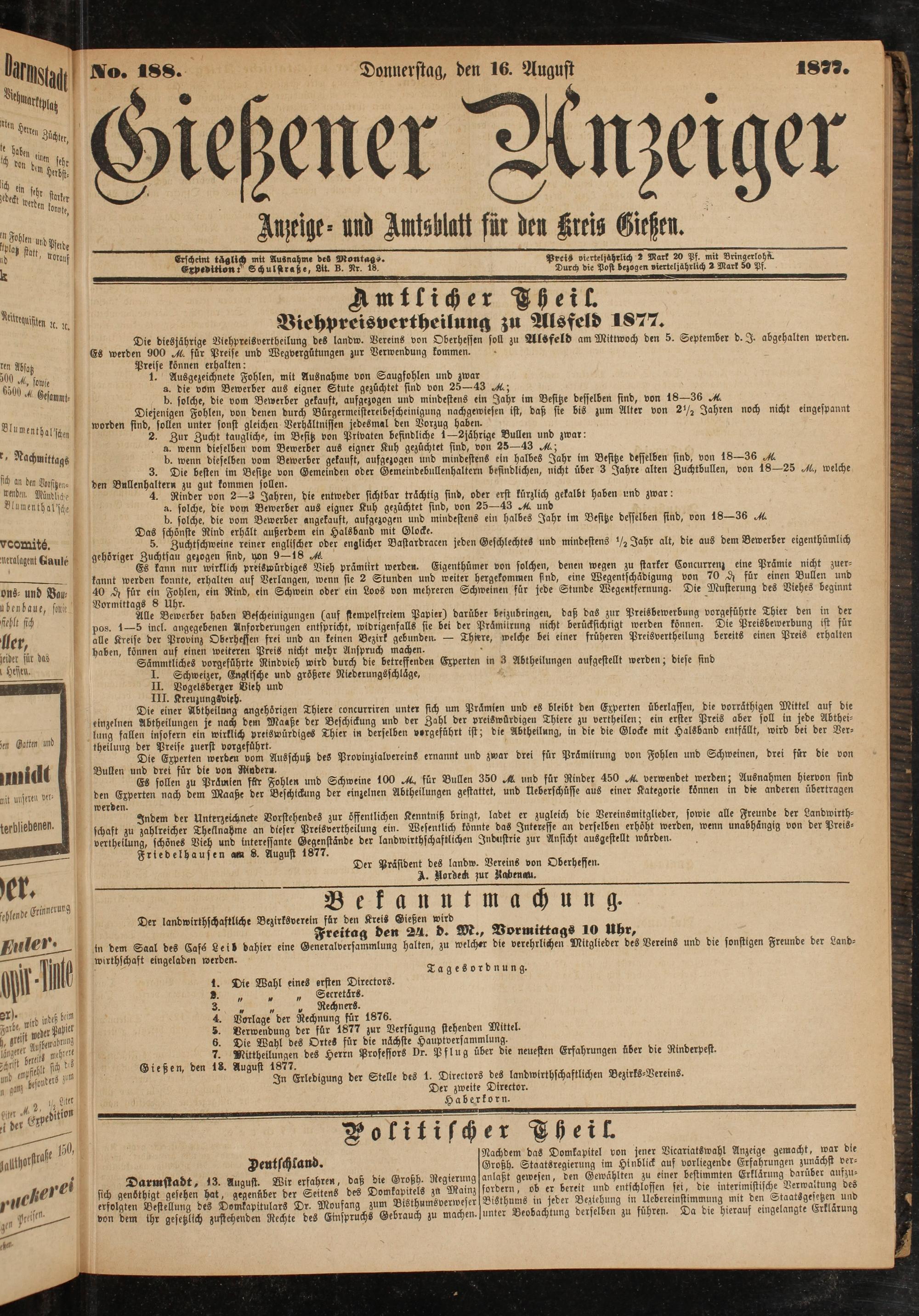 Die diesjährige Viehpreisvertheilung des landw. Vereins von Oberheffen soll zu AlSfeld am Mittwoch den 5. September d.J. abgehalten werden. Es werden 900 JL für Preise und Wegvergütungen zur Verwendung kommen.