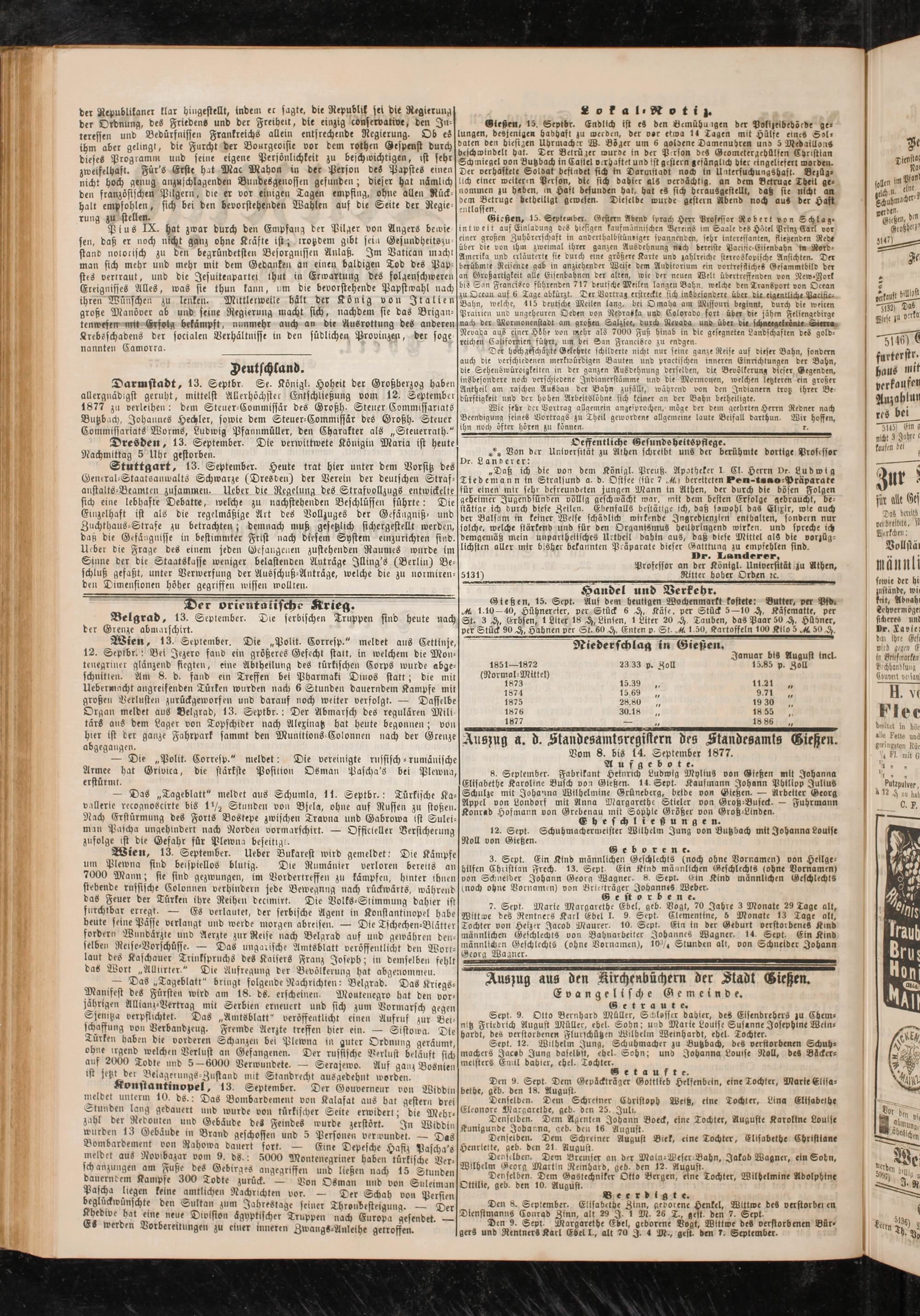 8. September. Fabrikant Heinrich Ludwig Myiius von Gießen mit Johanna Elisabethe Karoline Busch von Gießen. 14. Sept- Kaufmann Johann Philipp Julius Schulze mit Johanna Wilhelmine Grüneberg, beide von Gießen. — Arbeiter Georg Appel von Londorf mit Anna Margarethe Stielet von Grob-Buseck. — Fuhrmann Konrad Hofmann von Grebenau mit Sophie Größer von Groß-Linden.