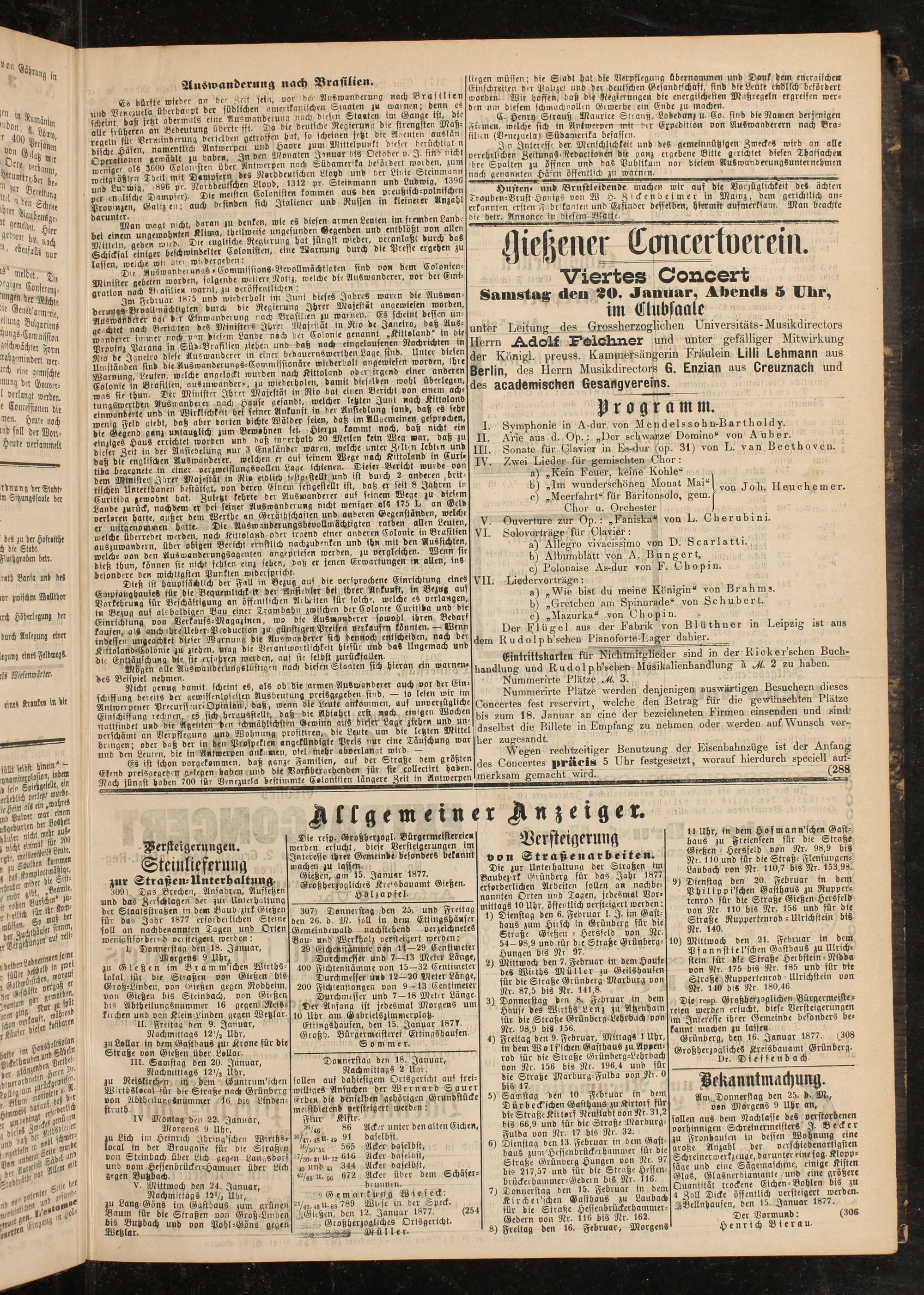 IV Montag den 22. Januar, Morgens 9 Uhr, zu Lich im Heinrich Jhring'schen Wirths- local in der Braugasse für die Straßen von Steinbach über Lich gegen Langsdorf und vom Hessenbrücker-Hammer über Lich gegen Butzbach.