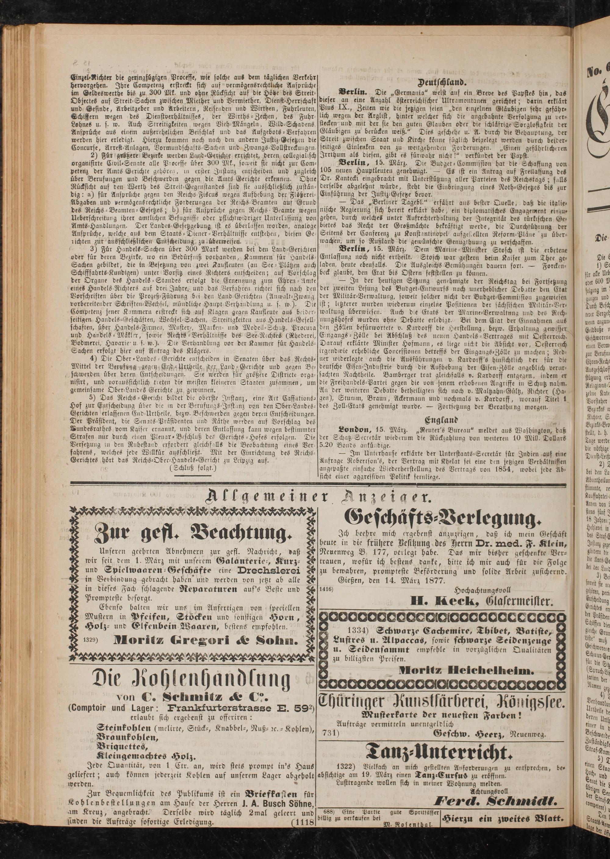 Berlin, 15. März. Die Budget-Commission hat die Schaffung von 105 neuen Hauptleuten genehmigt. — Es «st ein Antrag auf Freilassung des Dr. flantecki eingebracht mit Unterstützung aller Parteien 'des Reichstags ; falte derselbe abgelehnt würde, steht die Einbringung eines Noth-Gesetzes bis zur Einführung der Justiz-Gesetze bevor.