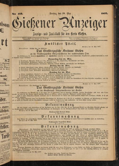 Das Büreau der unterzeichneten Behörde befindet sich von heute ab in der Behausung des Herrn L-chmall (Hessischen Hof) am Seltersberg. Gießen am 17. Mai 1877.