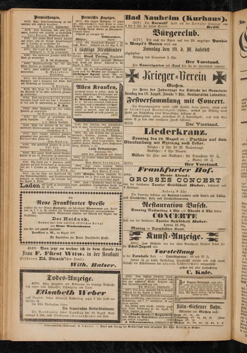Zur Feier des Jahrestags der Schlacht bei Gravelotte Samstag den 18. August, Abends 8 itljr, Restauration Lahnstein: Feftversammlnng mit Concert.