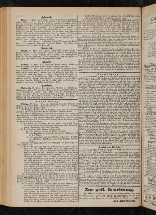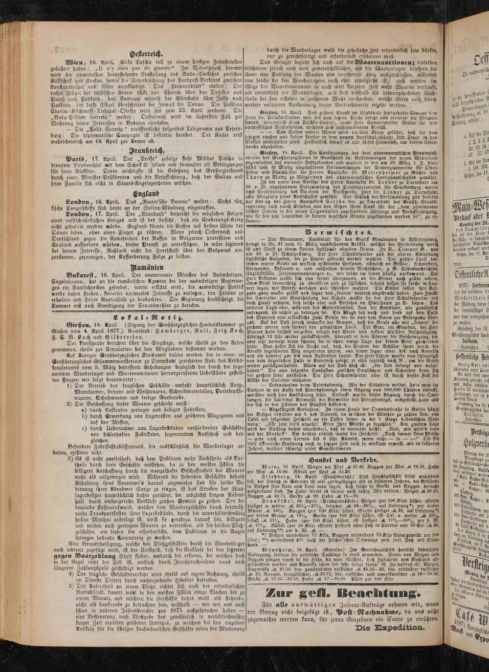Wien, 16. April, Äleko Pascha soll zu einem hiesigen Industriellen geäußert haben: „II ny aura pas de guerre.“ Im Liderspruch hiermit wird die unmittelbar bevorstehende Einstellung des Bahn-Verkehrs zwischen Rustschnk und Krakau, sowie bie Unterbrechung des Landpost-Verkebrs zwischen Konstantinopel und Wien angekündigt. Das ..Fremdenblatt" meldet: Der rechte Flügel der russischen Armee rückt von Chotim über den Dnjester und Pruth nach Paskany, das Centrum mittelst der Eisenbahn über Jasiy nach Paskany, der linke Flügel überschreitet bei Ismail die Donau. Die Position Chotim-Kischeneff-Trrsapol-Odefla wird bis zum 23. April geräumt. Die „Buda-Pesther Corresp." meldet: Oesterreich wird im äußersten Fall zur Wahrung seiner Interessen in Bosnien einrücken.