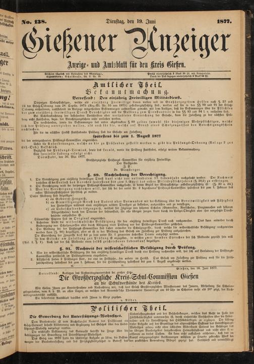 Für die im nächsten Herbst stattfindende Prüfung sind die Gesuche um Zulassung spätestens bis zum 1. August 1877