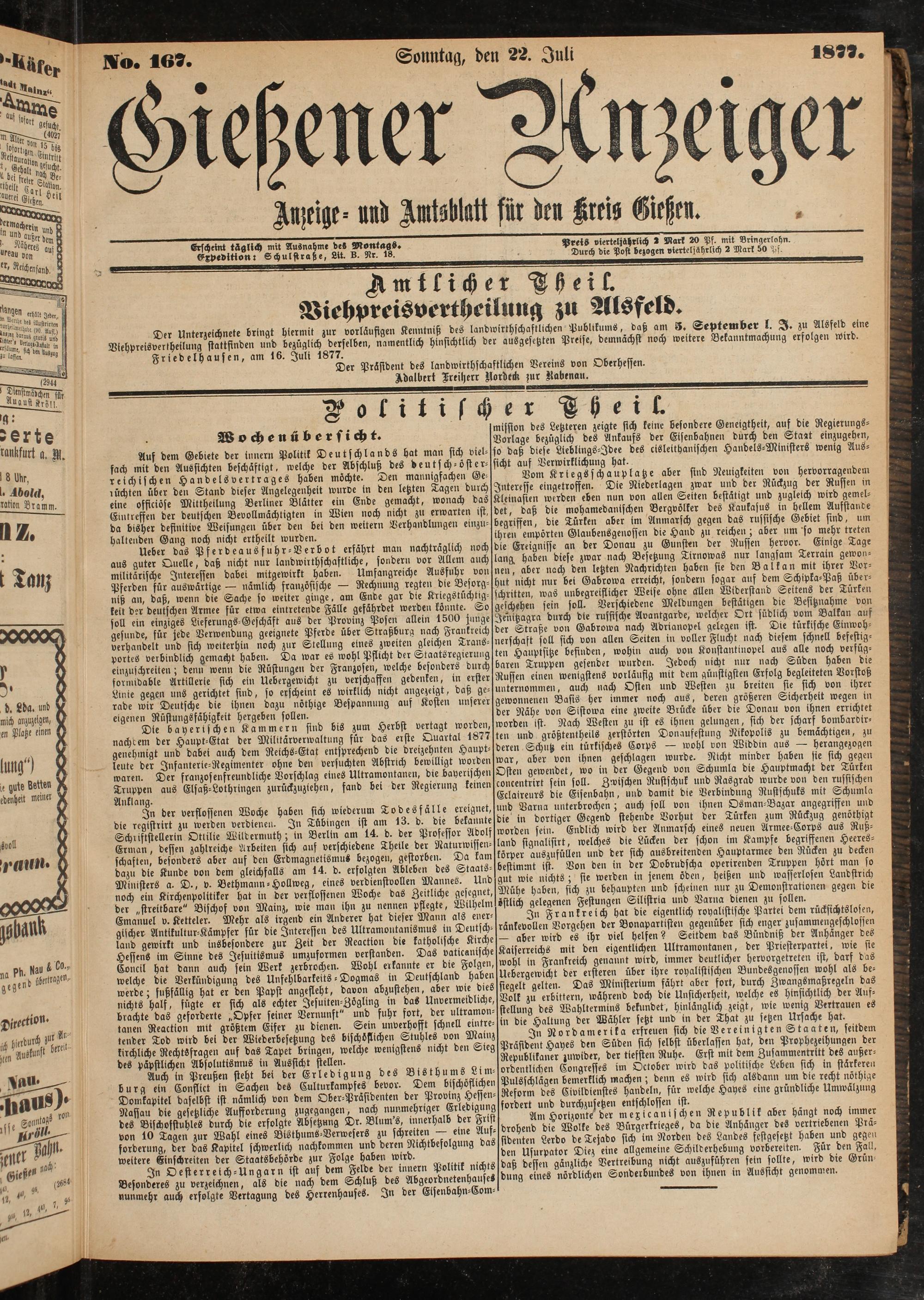 Die bayerischen Kammern sind bis zum Herbst vertagt worden, nacht em der Haupt-Etat der Militärverwaltung für das erste Quartal 1877 genehmigt und dabei auch dem Reichs-Etat entsprechend die dreizehnten Hauptleute der Infanterie-Regimenter ohne den versuchten Abstrich bewilligt worden waren. Der franzosenfreundliche Vorschlag eines Ultramontanen, die bayerischen Truppen aus Elsaß-Lothringen zurückzuziehen, sand bei der Regierung keinen