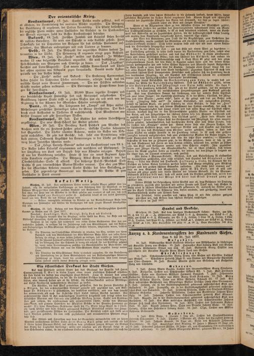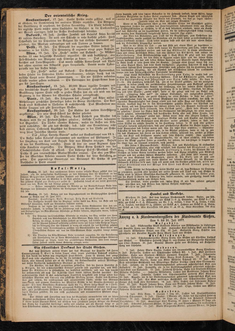 9 Juli. Elise Anna, 9 Monate 1 Tag alt, Tochter des Etat onsbeamten Heinrich Schaumann. 8. Juli. Theodor. 3 Monate alt, Sohn des Spenglers Heinrich Köhler. 10. Juli. Johann Konrad, 24 Tage alt, Sohn des Arbeiters Johannes Damshäuser. 10. Juli. Kaminfeger Karl Neuling, 43 Jahre 5 Monate 21 Tage alt. 13 Juli. Schneider Johannes Müller, 29 Jahre alt, von Staufenberg ttm academlschen Hospital gestorben). 15. Juli. Marie Margarethe Körber, geborene Borner, 24 Jahre