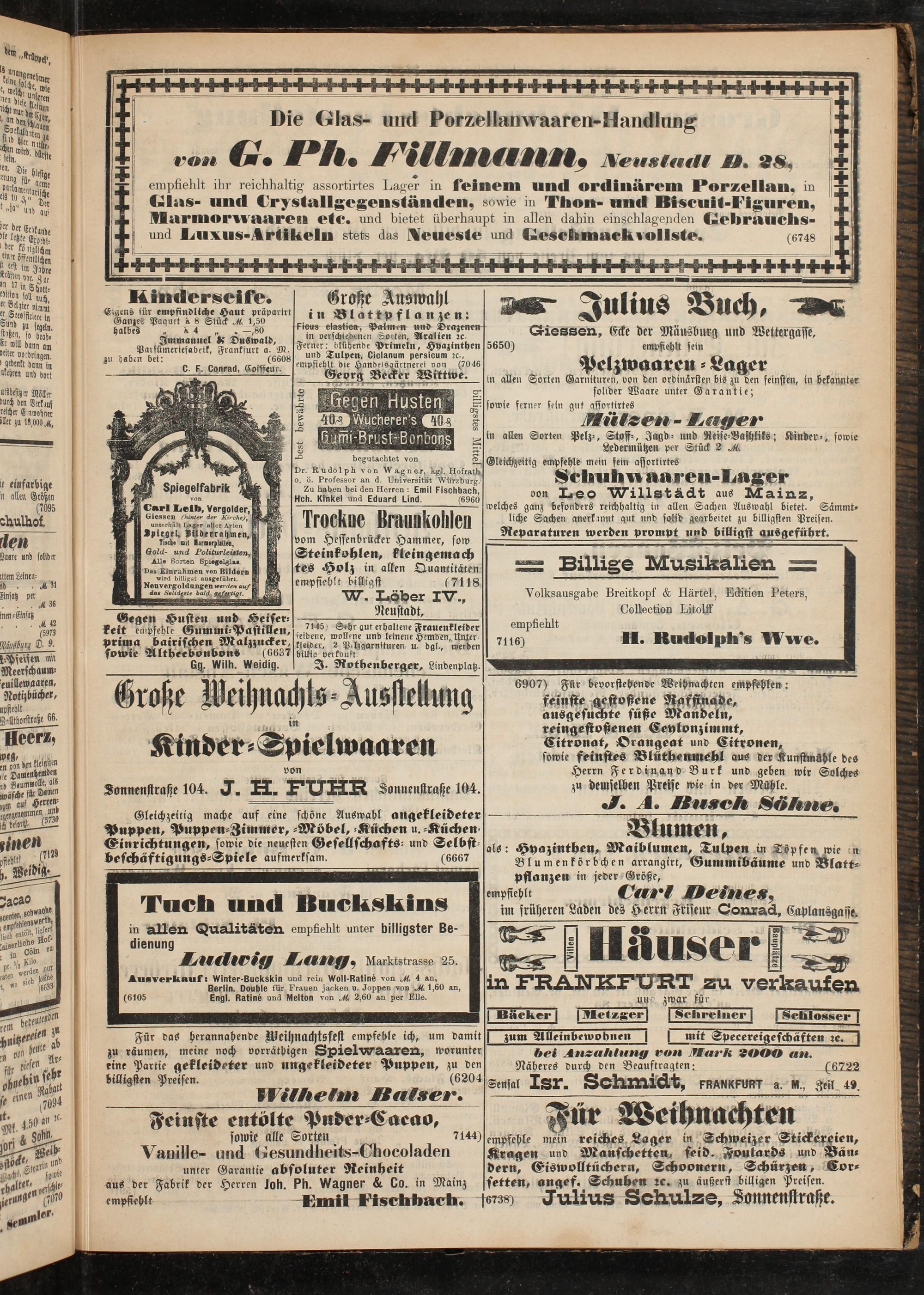 Für das herannahende Weihnachtsfest empfehle ich, um damit zu räumen, meine noch vorräthigen Spielwaaren, worunter eine Partie gekleideter und ungekleideter Puppen, zu den billigsten Preisen. (6204