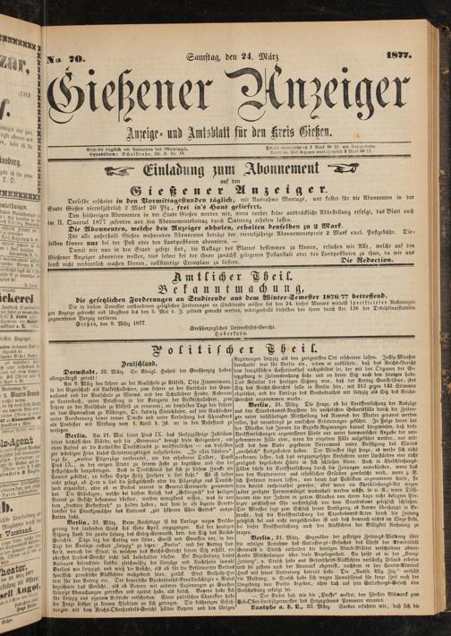 Den seitherigen Abonnenten in der Stadt Gießen werden wir, wenn vorher keine ausdrückliche Abbestellung erfolgt, das Blatt auch Quartal 1877 zusenden und den Abonnementsbetrag durch Quittung erheben lassen.