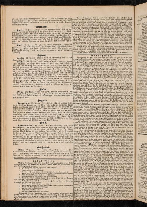 Gießen, 24. Januar. Wir lassen nachstehend die Tagesordnung der Stadt- verordneten-Sitzung am Donnerstag den 23. Januar 1877 im Sitzungssaals dealten RealschulgebäudeS folgen: