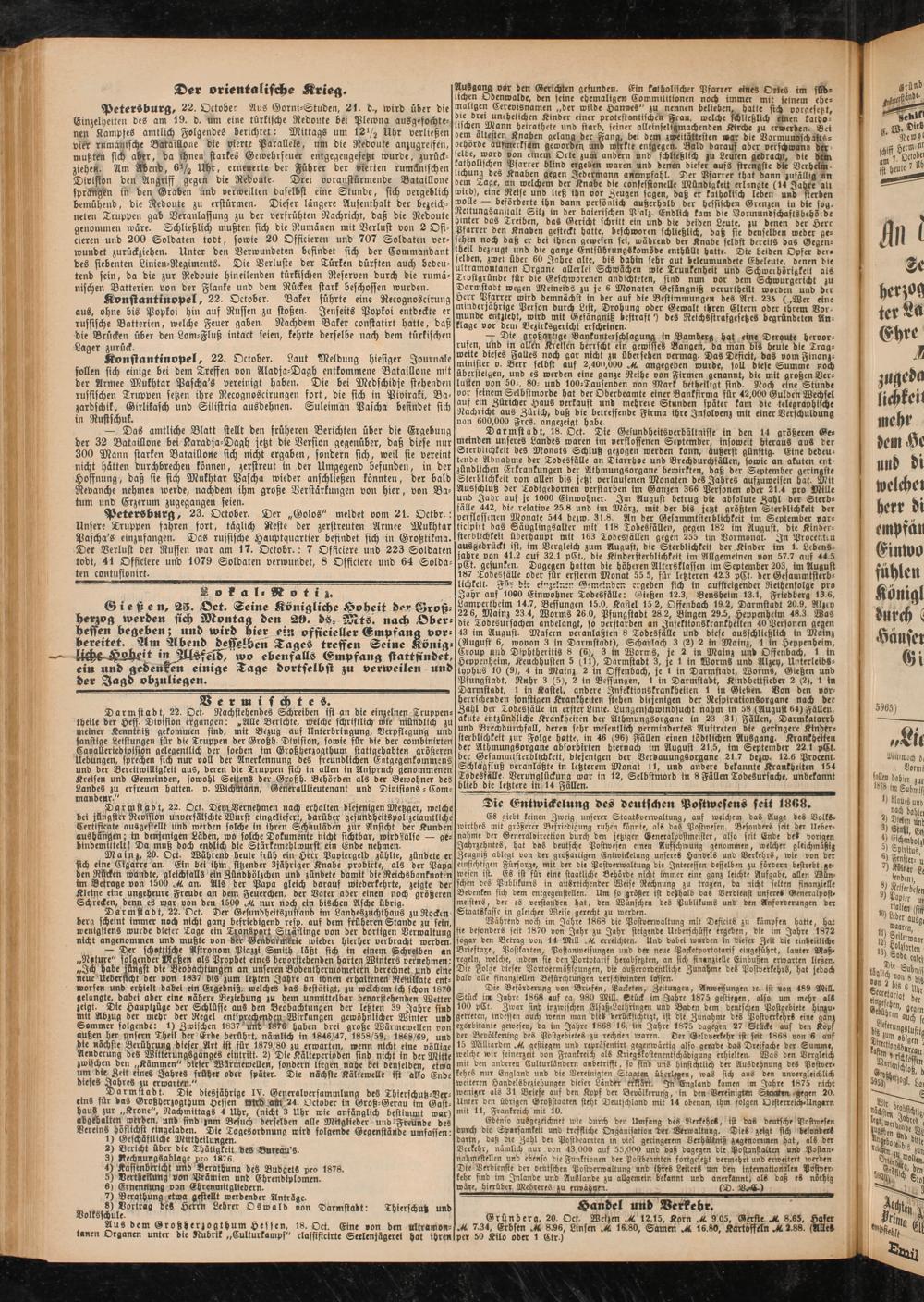 Konstantinopel, 22. October. Laut Meldung hiesiger Journale sollen sich einige bei dem Treffen von Aladsa-Dagh entkommene Bataillone mit der Armee Mukhtar Paschals vereinigt haben. Die bei Medschidje stehenden russischen Truppen setzen ihre Recognoscirungen fort, die sich in Piviraki, Ba« zardschik, Girlikasch und Silistria ausdehnen. Suleiman Pascha befindet sich in Rustschuk.