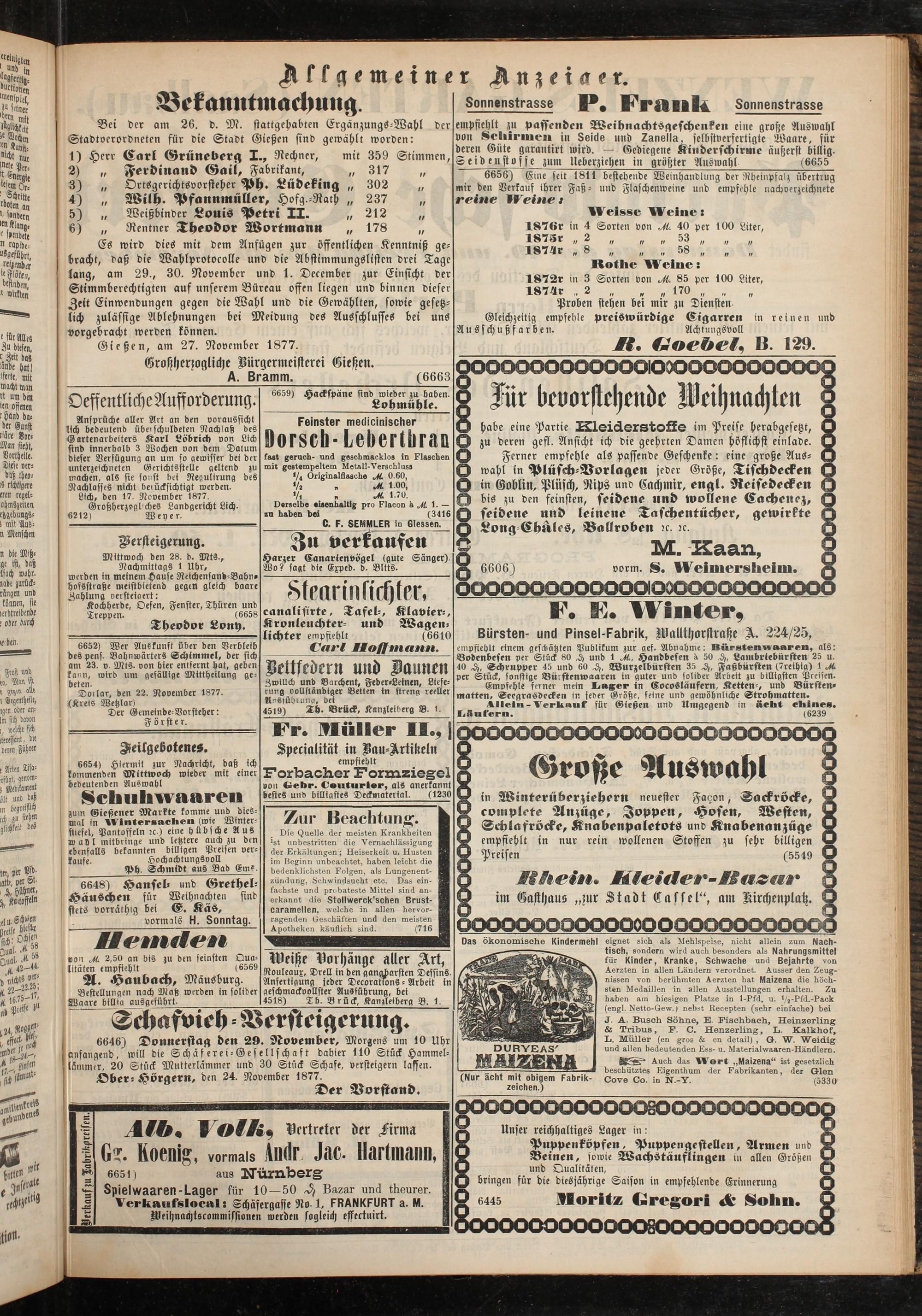 Bei der am 26. d. M. stattgehabten Ergänzungs-Wahl der Stadtverordneten für die Stadt Gießen sind gewählt worden: 1) Herr Carl Grüneberg I., Rechner, mit 359 Stimmen,