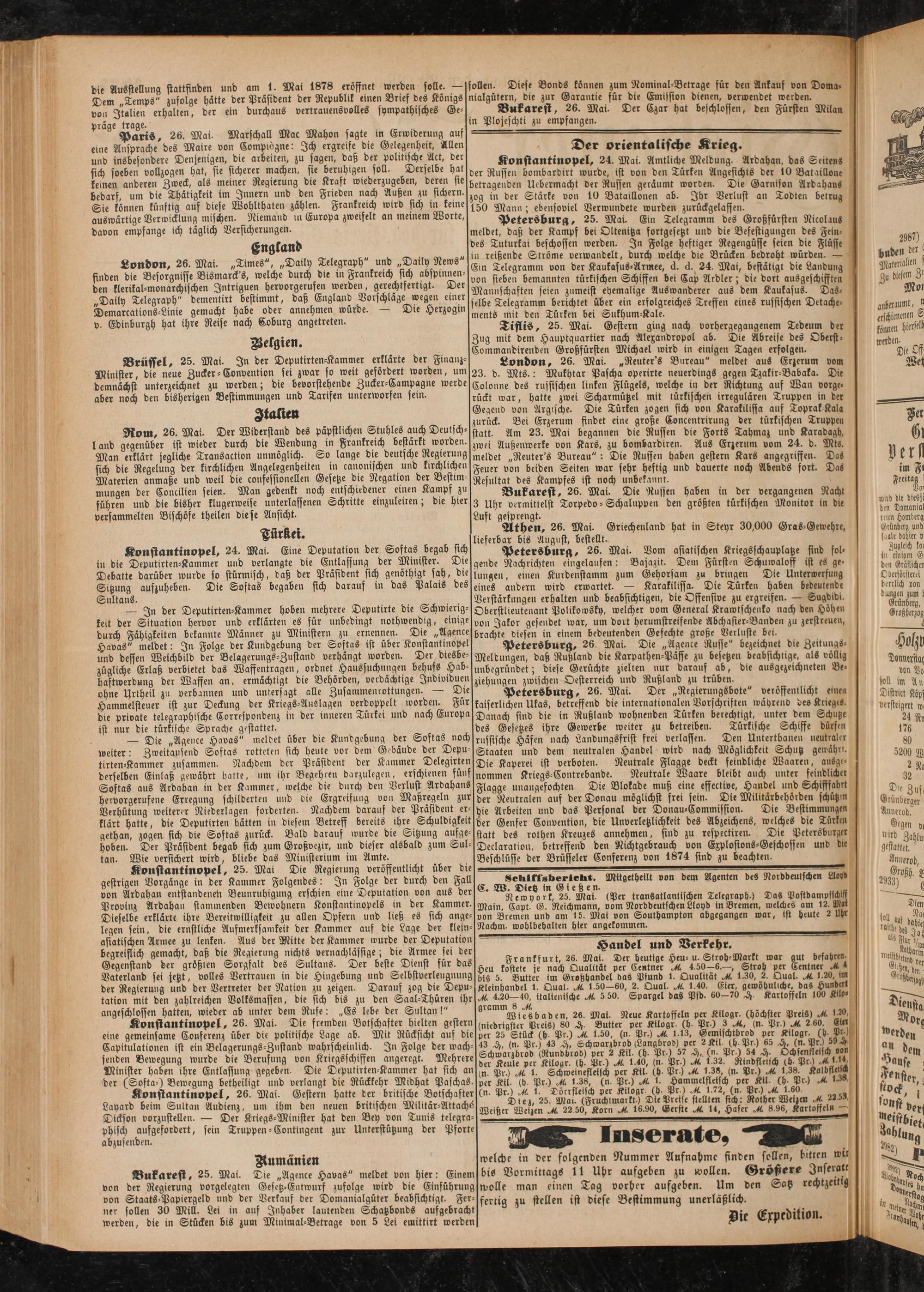 London, 26. Mai. „Reuter's Bureau" meldet aus Erzerum vom 23. d. Mts.: Mukhtar Pascha operirte neuerdings gegen Tzakir-Babaka. Die Colonne des russischen linken Flügels, welche in der Richtung auf Wan vorge- rückt war, hatte zwei Scharmützel mit türkischen irregulären Truppen in der Gegend von Argische. Die Türken zogen sich von Karakilissa auf Toprak Kala zurück. Bei Erzerum findet eine große Concentrirung der türkischen Truppe» statt. Am 23. Mai begannen die Russen die Forts Tahmaz und Karadagh, zwei Außenwerke von Kars, zu bombardiren. Aus Erzerum vom 24. d. Mts. meldet „Reuter's Bureau" : Die Russen haben gestern Kars angegriffen. Das Feuer von beiden Seiten war sehr heftig und dauerte noch Abends fort. Das Resultat des Kampfes ist noch unbekannt.